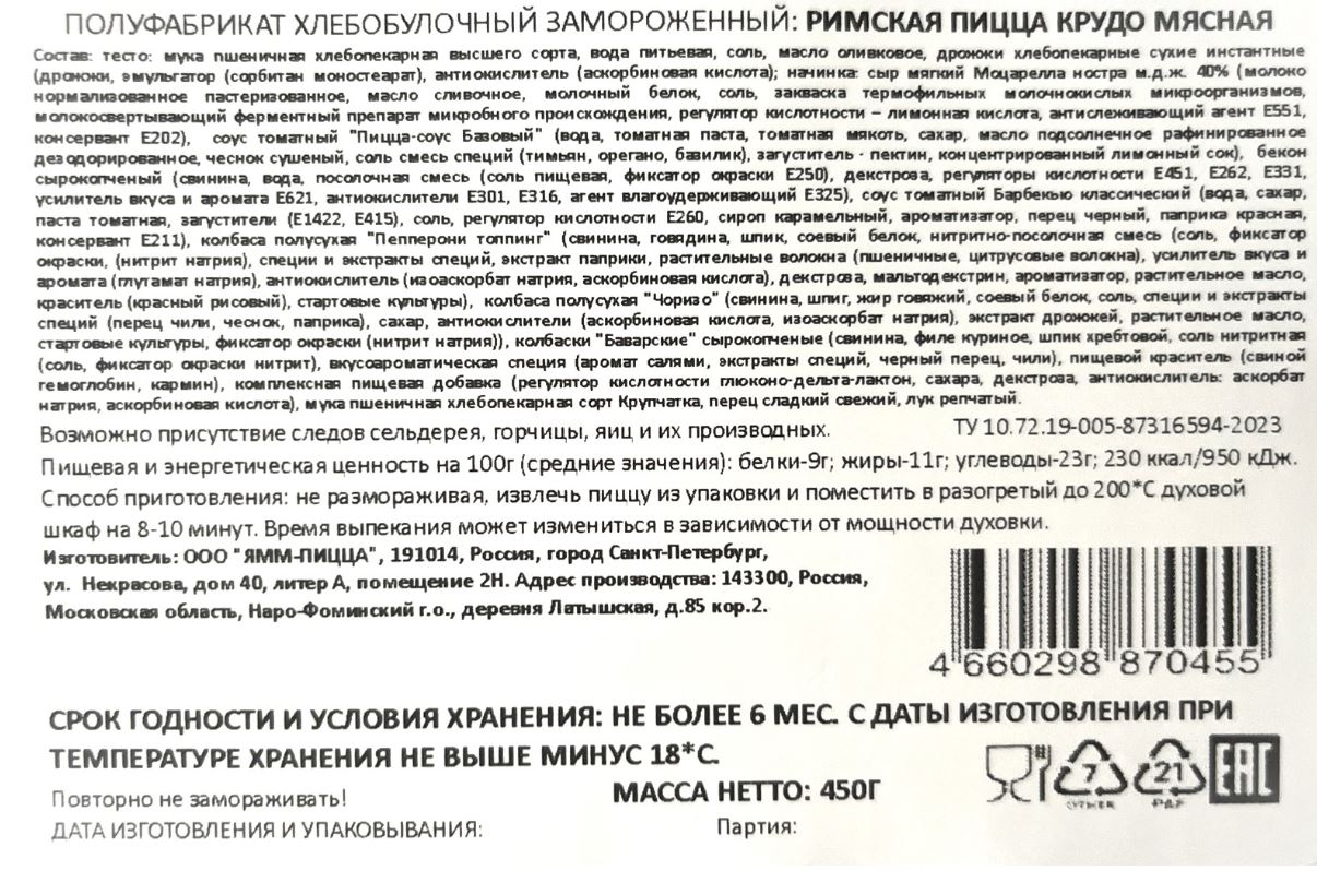 Тестовая основа: мука пшеничная хлебопекарная высшего сорта для изготовления пиццы, вода питьевая, соль, масло оливковое, дрожжи хлебопекарные сухие инстантные дрожжи, эмульгатор сорбитан моностеарат, антиокислитель аскорбиновая кислота. Начинка: сыр мягкий Моцарелла ностра (молоко нормализованное пастеризованное, масло сливочное, молочный белок, соль, закваска термофильных молочнокислых микроорганизмов, молокосвертывающий ферментный препарат микробного происхождения), регулятор кислотности лимонная кислота, антислеживающий агент Е551, консервант Е202, соус томатный Пицца-соус Базовый вода, томатная паста, томатная мякоть, сахар, масло подсолнечное рафинированное дезодорированное, чеснок сушёный, соль смесь специй тимьян, орегано, базилик, загуститель пектин, концентрированный лимонный сок, бекон сырокопчёный свинина, вода, посолочная смесь соль пищевая, фиксатор окраски Е250, мука пшеничная хлебопекарная сорт Крупчатка, перец сладкий свежий, лук репчатый.