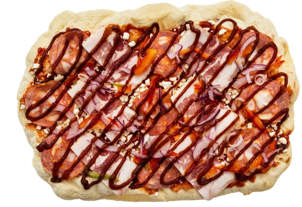 Римская пицца на пышном кружевном парбейке, с потрясающими насыщенными вкусами Пепперони, Чоризо и Баварскими колбасками.