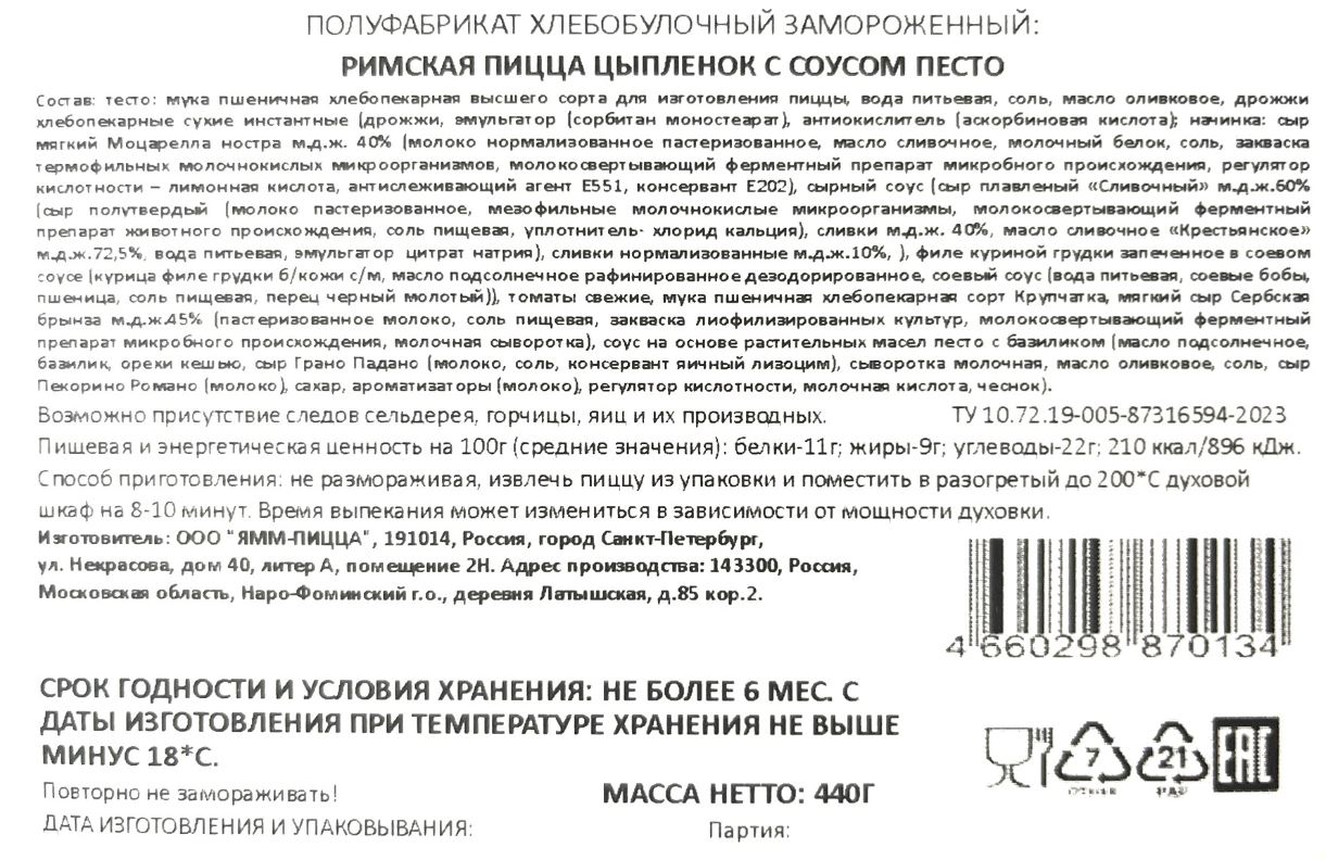 Тестовая основа: мука пшеничная хлебопекарная высшего сорта для изготовления пиццы, вода питьевая, соль, масло оливковое, дрожжи хлебопекарные сухие инстантные дрожжи, эмульгатор сорбитан моностеарат, антиокислитель аскорбиновая кислота. Начинка: сыр мягкий Моцарелла ностра молоко нормализованное пастеризованное, масло сливочное, молочный белок, соль, закваска термофильных молочнокислых микроорганизмов, молокосвертывающий ферментный препарат микробного происхождения, регулятор кислотности – лимонная кислота, антислеживающий агент Е551, консервант Е202, сырный соус сыр плавленый Сливочный 60% сыр полутвёрдый молоко пастеризованное, мезофильные молочнокислые микроорганизмы, молокосвертывающий ферментный препарат животного происхождения, соль пищевая, уплотнитель - хлорид кальция, сливки, масло сливочное Крестьянское, вода питьевая, эмульгатор цитрат натрия, сливки нормализованные, филе куриной грудки запечённое в соевом соусе курица филе грудки, масло подсолнечное рафинированное дезодорированное, соевый соус вода питьевая, соевые бобы, пшеница, соль пищевая, перец чёрный молотый, томаты свежие, мука пшеничная хлебопекарная сорт Крупчатка, мягкий сыр Сербская брынза пастеризованное молоко, соль пищевая, закваска лиофилизированных культур, молокосвертывающий ферментный препарат микробного происхождения, молочная сыворотка, соус на основе растительных масел песто с базиликом масло подсолнечное, базилик, орехи кешью, сыр Грано Падано молоко, соль, консервант яичный лизоцим, сыворотка молочная, масло оливковое, соль, сыр Пекорино Романо молоко, сахар, ароматизаторы молоко, регулятор кислотности, молочная кислота, чеснок.