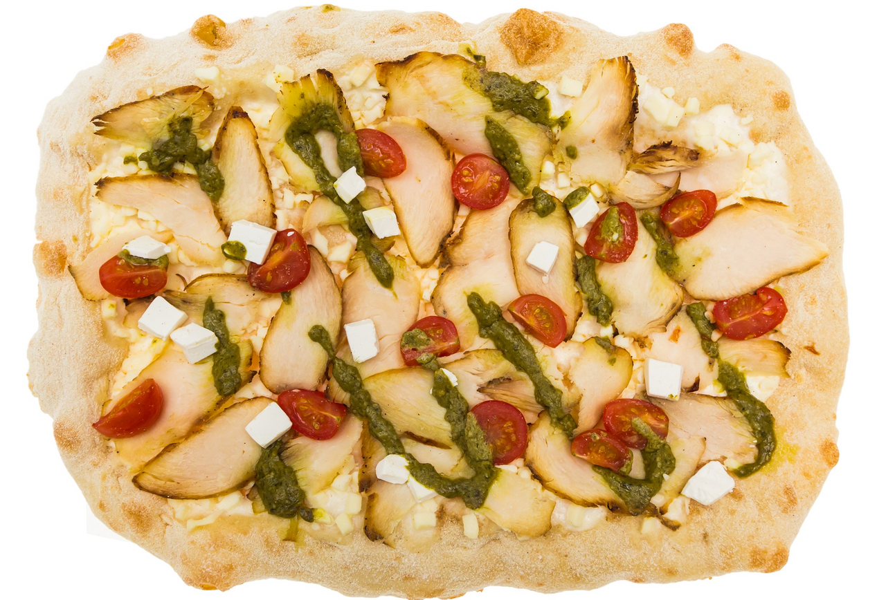 Римская пицца на пышном кружевном парбейке, с авторским соусом, нежным филе цыпленка и пикантным соусом Песто. Это запечённое куриное филе в комбинации со сливочной моцареллой, соусом песто и вяленых томатов черри, маринованных в масле. Воздушное и хрустящее тесто.
