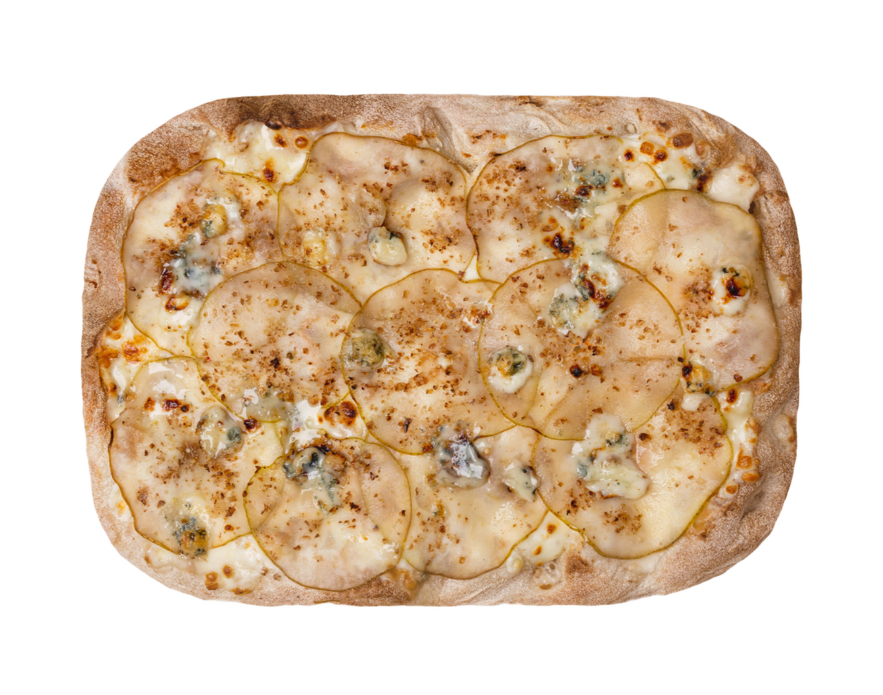 Пицца с моцареллой, сыром с голубой плесенью, грушей, грецким орехом, медом цветочным, красным острым перец и сливочным соусом. Рекомендации по приготовлению: разогреть духовку до 210С, снять пленку, выложить пиццу на решетку. Выпекать замороженную пиццу 11 минут.