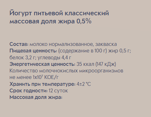 Экологически чистый, натуральный питьевой йогурт. Молоко для производства йогурта получено от коров Голштинской породы с собственных ферм братьев Чебурашкиных. Йогурт обладает нежным натуральным вкусом и легкой для употребления консистенцией. Пониженное содержание жира делает продукт более привлекательным для лиц соблюдающих низкокалорийную диету.Не содержит антибиотики, ��ормоны, красители,загустители, консерванты.