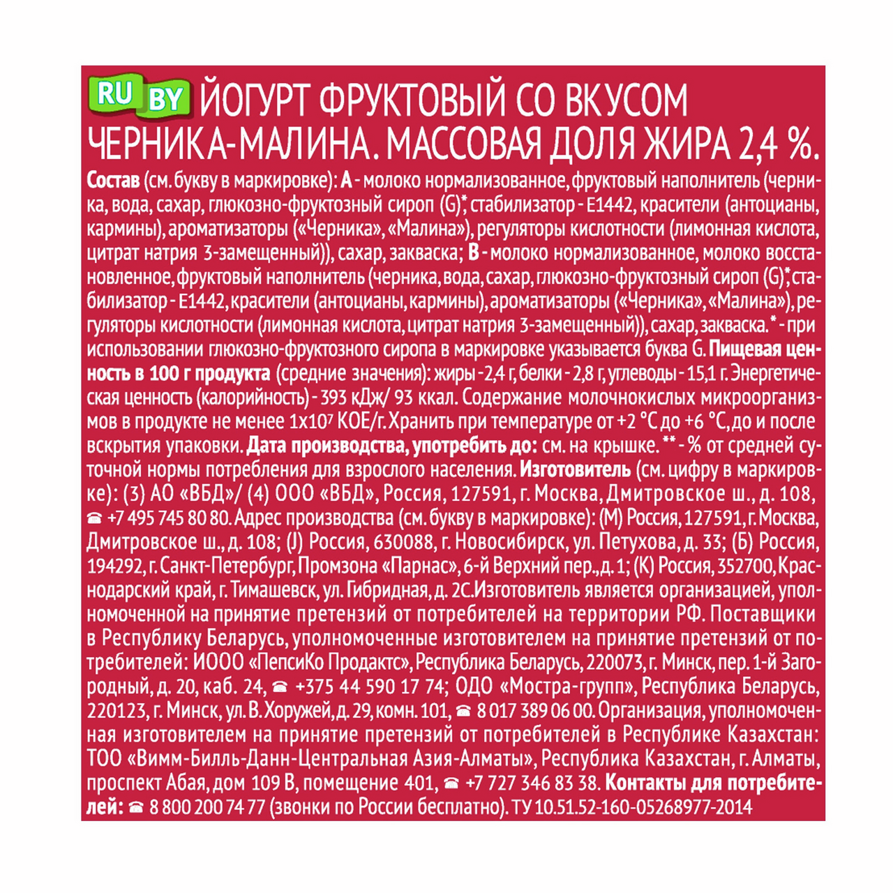 Йогурт питьевой Чудо фруктовый со вкусом черники и малины 2.4%, 270г
