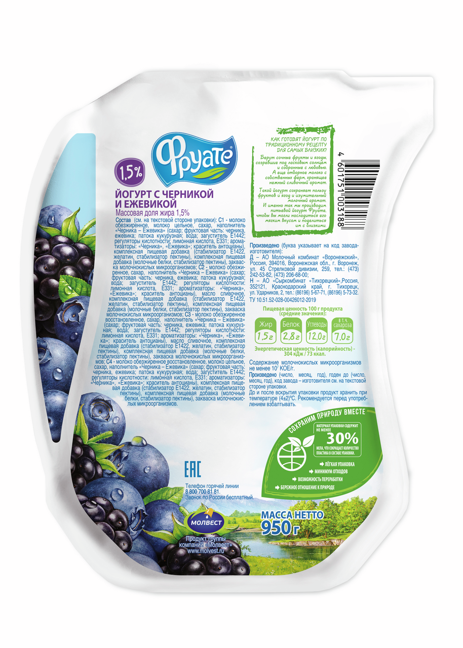 Йогурт питьевой Фруате черника и ежевика 1.5%, 950г