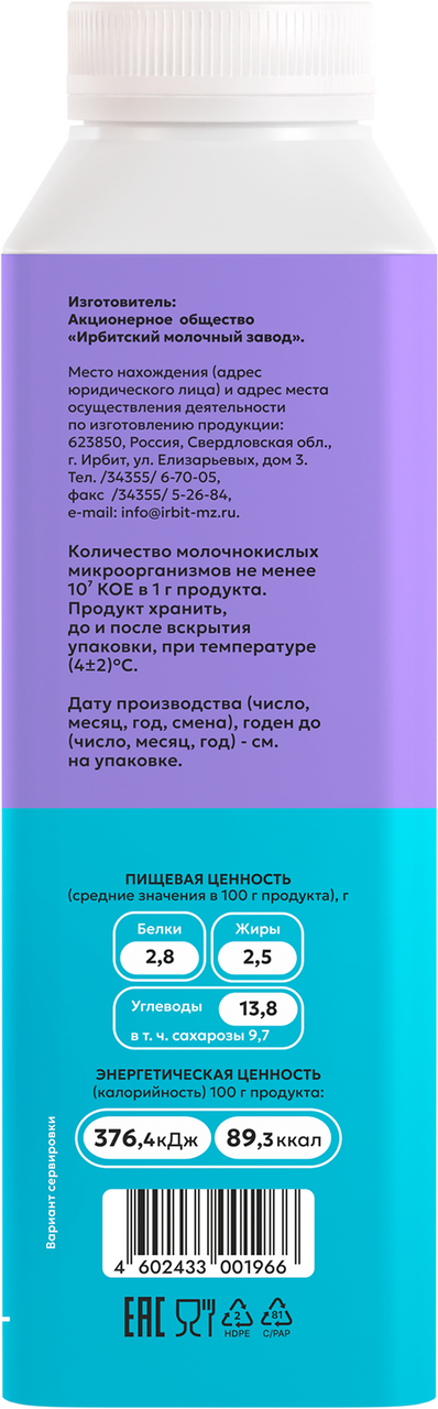 Йогурт питьевой Ирбитский молочный завод Ирбитский черника 2.5%, 500г — продукт, изготовленный из превосходного молока. Обладает особенным черничным ароматом и невероятно ярким вкусом. Это готовый полезный и вкусный перекус на случай, когда мало времени. Продукт продается в надежной и компактной упаковке TetraTop, которая поместится даже в небольшую сумку, поэтому ее удобно брать с собой на работу или на прогулку. АО Ирбитский молочный завод производит молочные продукты уже 95 лет. Продукция завода неизменно проходит контроль качества на всех этапах производства.