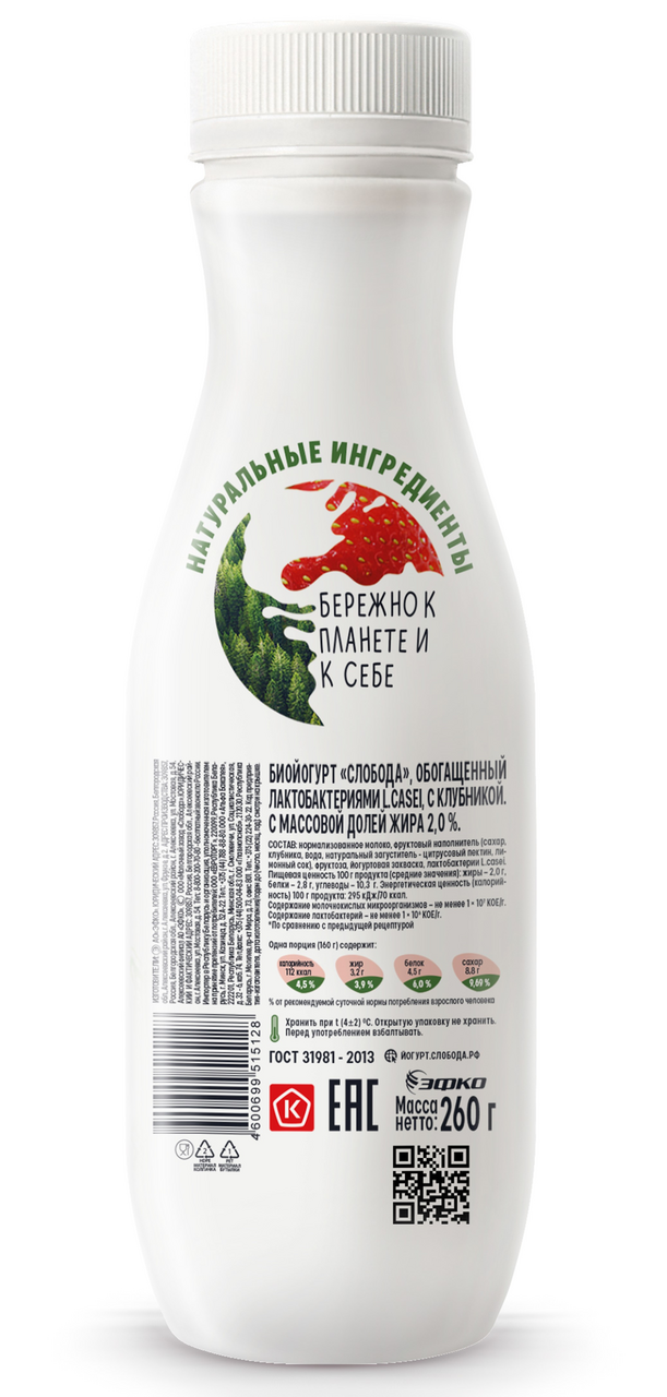 Тепло солнечных дней в натуральном йогурте с кусочками спелых ягод клубники и пользой лактобактерий L.casei подарит Вам биойогурт СлободаТолько натуральные ингредиентыБез искусственных добавокНе содержит ГМОБез крахмалаБез консервантовБез усилителей вкусаПриготовлен по ГОСТ 31981-2013Проверен Органик-контрольОбогащен лактобактериями L.casei