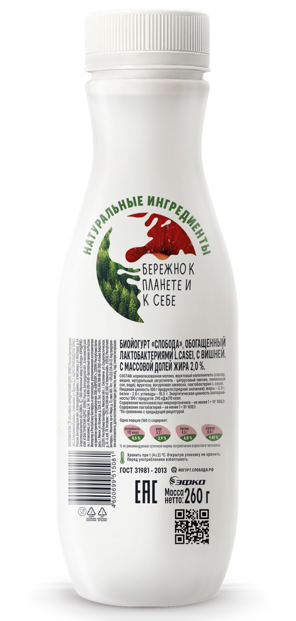 Изысканное сочетание сочных ягод ароматной? вишни, легкости молочного йогурта и пользой лактобактерий L.casei - все это биойгурт СлободаТолько натуральные ингредиентыБез искусственных добавокНе содержит ГМОБез крахмалаБез консервантовБез усилителей вкусаПриготовлен по ГОСТ 31981-2013Проверен Органик-контрольОбогащен лактобактериями L.casei