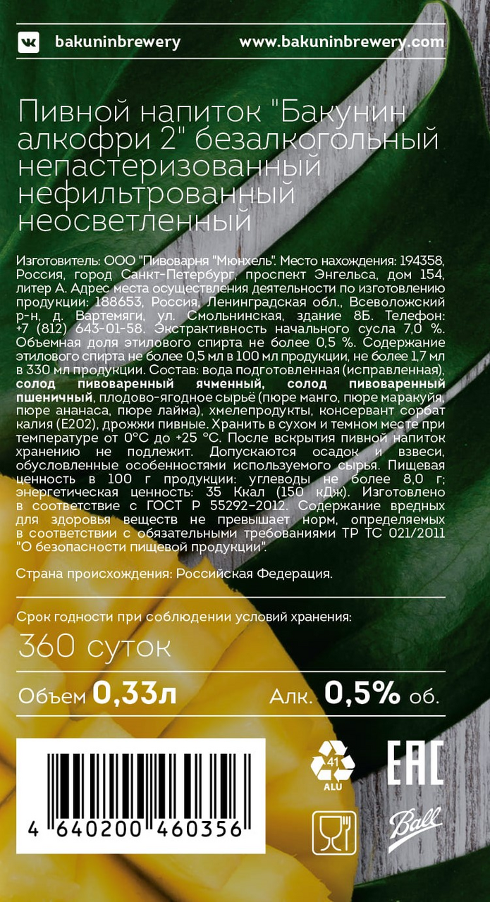Пиво Бакунин Easy Thai безалкогольное, 0.5л