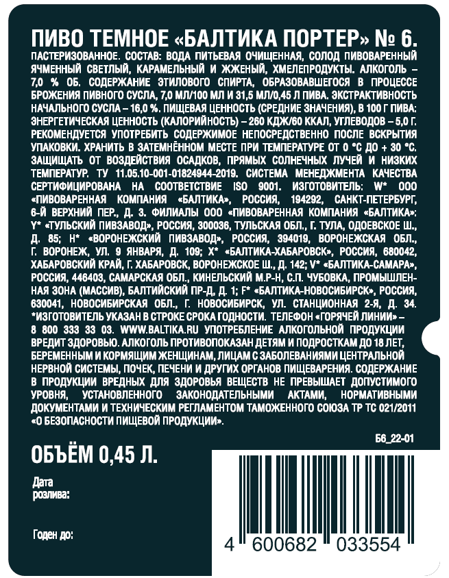 Пиво Балтика №6 Портер, 0.45л