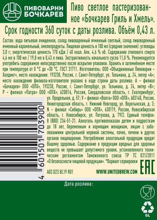 Пиво Бочкарев Гриль и хмель светлое, 0.43л