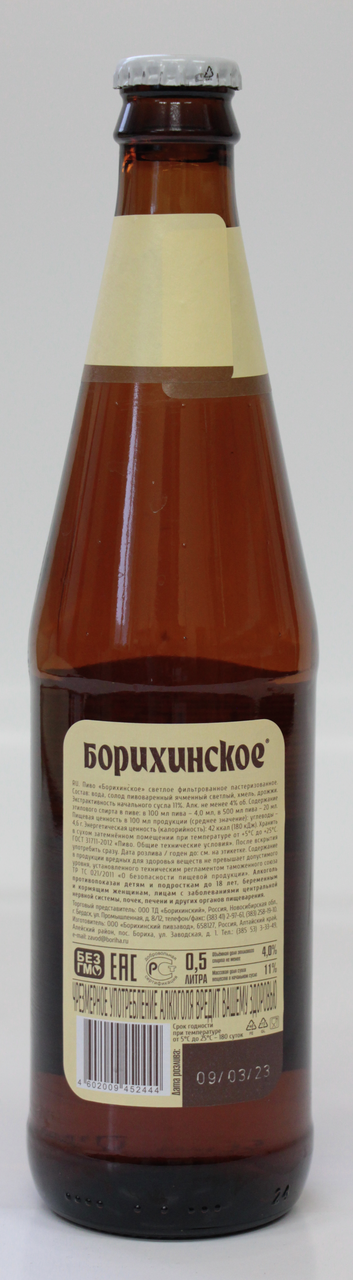 Яркий соломенный цвет с освежающей горчинкой во вкусе и чистый солодовый аромат подарят настоящее удовольствие ценителям напитка и позволят насладится вкусом всеми любимого светлого пива. Для приготовления этого сорта использованы оригинальное сырье лучших чешских производителей и специально подготовленная вода с артезианской скважины в Алтайском крае. Борихинское пиво по праву называется – живым, т.к. никогда не подвергается пастеризации.