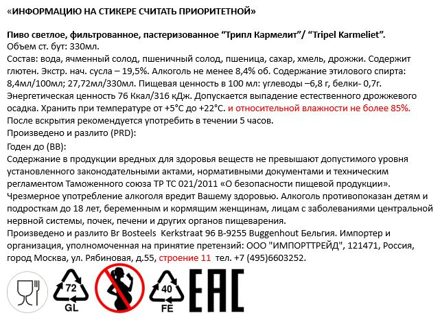 Тройной светлый эль с дображиванием в бутылке, который был впервые сварен в 1679 году. Приготовлен этот великолепный эль с использованием трех злаков: пшеницы, ячменя и овса по рецептуре XVII века. Сохранилась запись 300-летней давности, где описан рецепт приготовления пива из трех видов зерновых: пшеницы, овса и ячменя. Пиво производится путем двойного брожения с дображиванием в бутылке, поэтому его цвет всегда слегка мутный. На горлышке бутылки пива Tripel Karmeliet изображен герб ордена Кармелитов.
