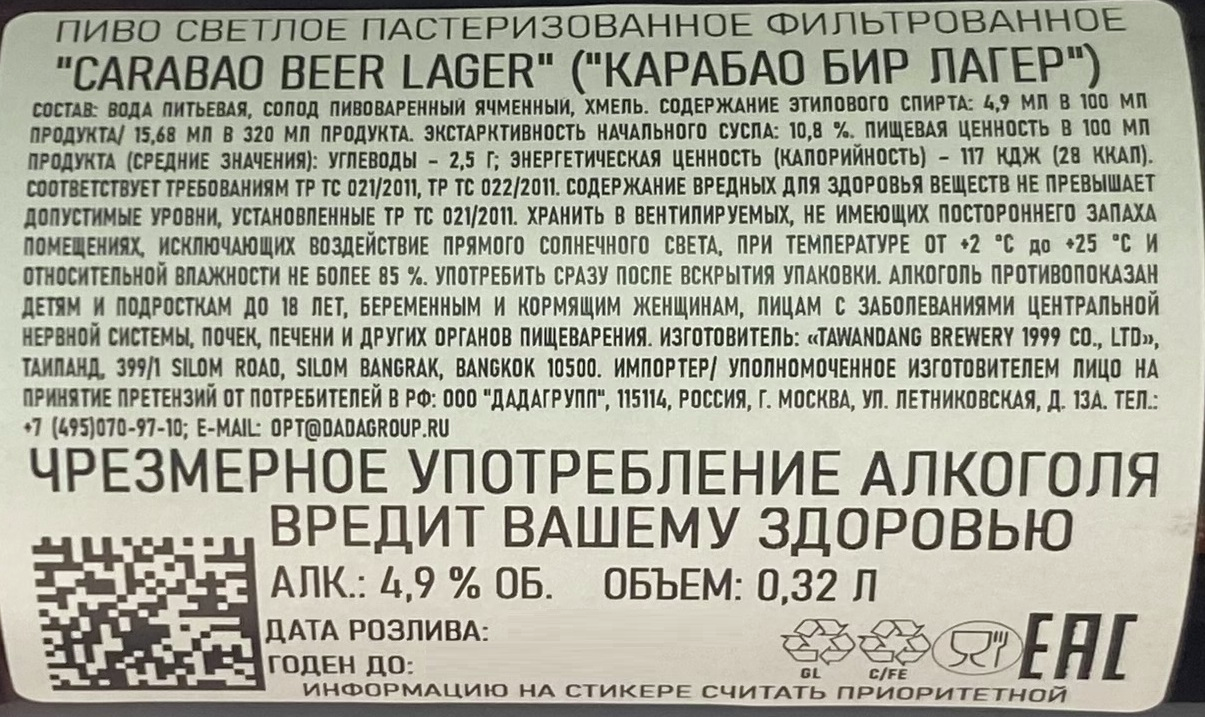Карабао - это пиво светлое фильтрованное пастеризованное. Для его изготовления используется ячменный солод, хмель и чистая вода, что гарантирует напитку непревзойденные органолептические свойства. Пиво хорошо сочетается со снэками, легкими закусками, несложными горячими блюдами из рыбы и мяса, пиццей, сырами, несладкой выпечкой.