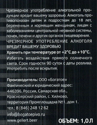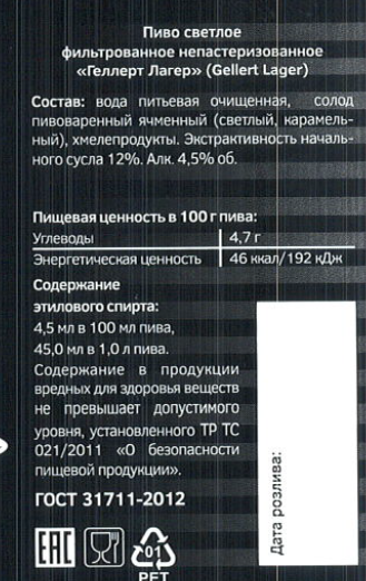 Пиво Gellert Lager светлое непастеризованное фильтрованное, 1л
