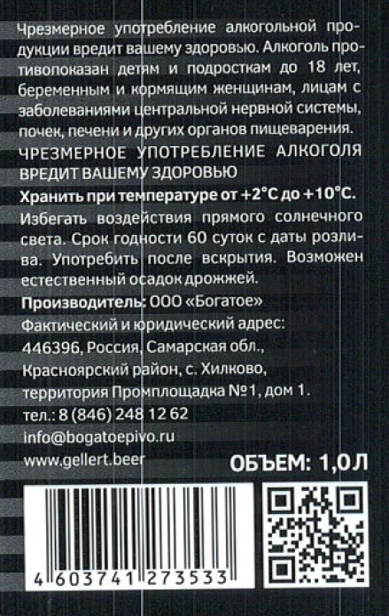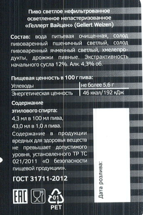 Пиво Gellert Weizen пшеничное светлое непастеризованное нефильтрованное, 1л