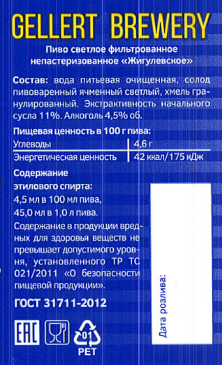 Пиво Gellert Жигулевское светлое непастеризованное фильтрованное, 1л