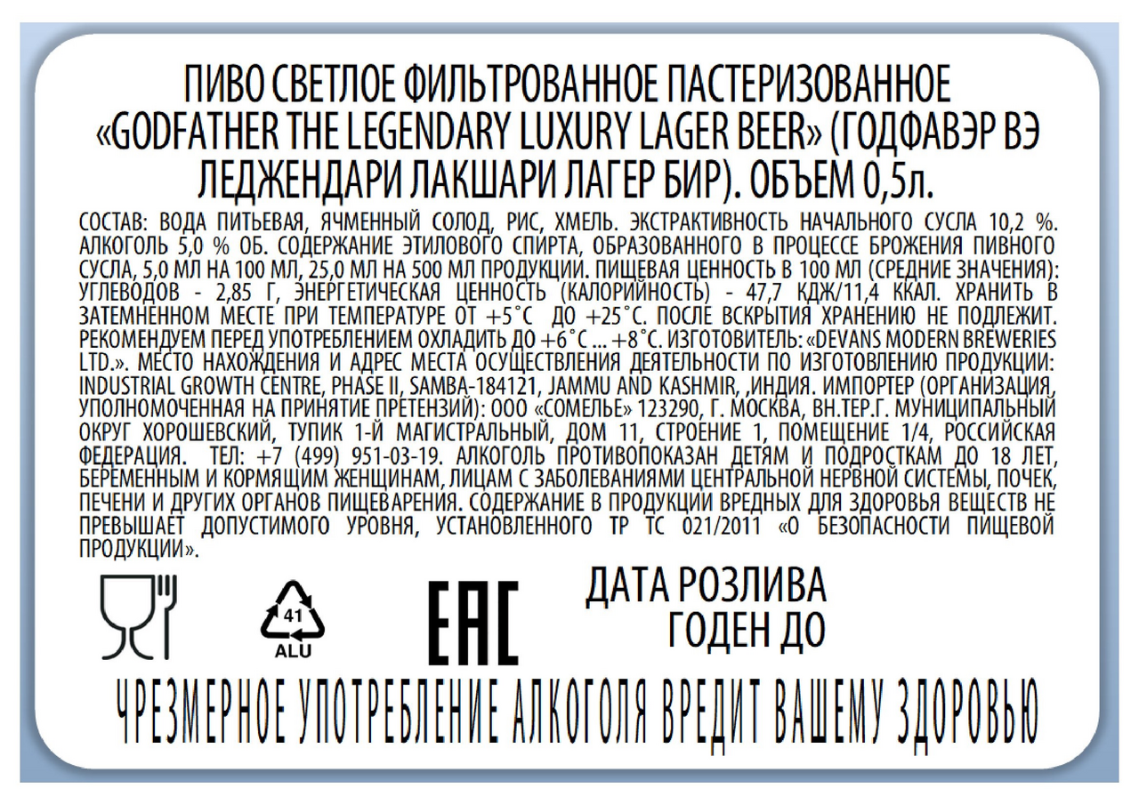 Этот легендарный бренд выдержал испытание временем, пленяя сердца любителей пива на протяжении белее шести десятилетий. Созданный с непоколебимой приверженностью качеству и являющимся символом совершенства. Godfather Luxury Lager - Legendary Beer, популярное в северных и восточных штатах Индии, известно своим мягким, насыщенным вкусом, приятным ароматом, устойчивой пеной со средней полнотелостью. Пиво варится из лучших ингредиентов под строгим контролем качества, из отборного местного ячменного солода и превосходного немецкого хмеля. Крёстный Отец - это нечто особенное, задевающее чувство как молодых, так и умудрённых опытом потребителей пива.