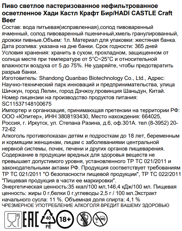 Пиво Hadi Castle Craft светлое нефильтрованное, 1л