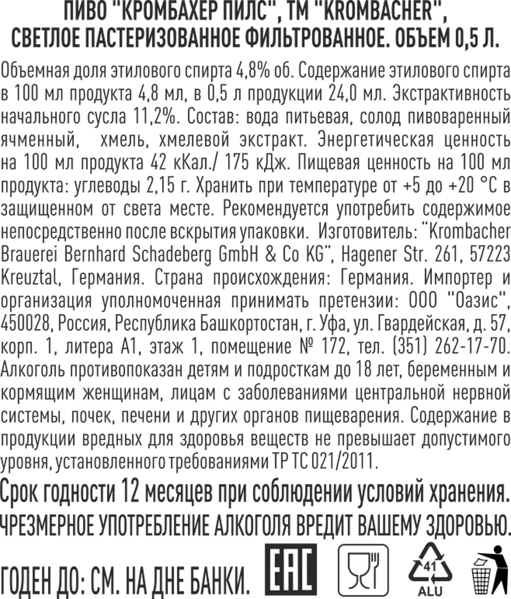 Krombacher Pils — уникальный немецкий пилснер премиум-класса с полным вкусом с легкой горчинкой. Пиво варится по традиционному рецепту с применением современных технологических процессов и исключительно из натурального сырья. Чистый, безошибочно узнаваемый вкус пива Кромбахер пивовары компании связывают, в первую очередь, с используемой чистейшей родниковой водой из горного ручья, отфильтрованной натуральным способом через множество слоев горных пород и имеющей уникальный вкус.