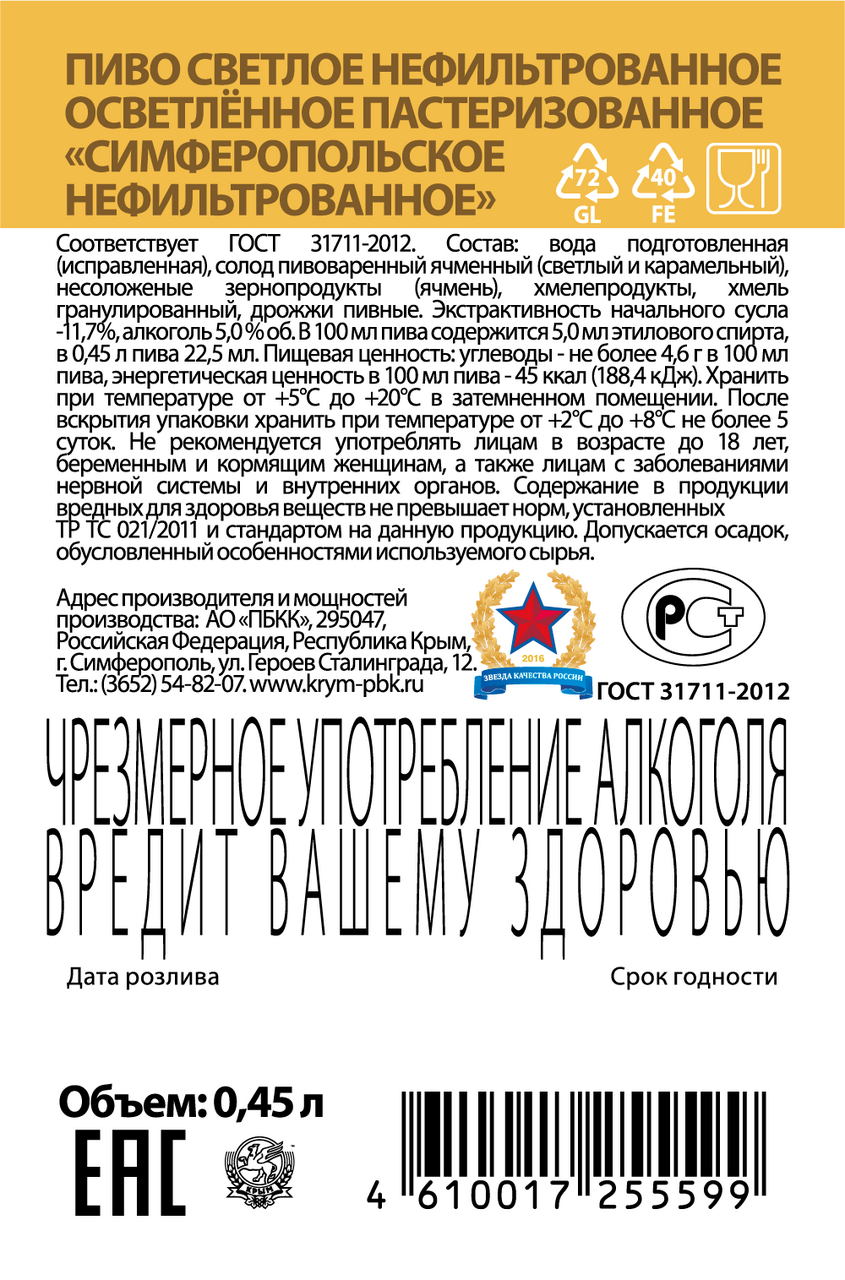 Пиво Крым Симферопольское нефильтрованное ГОСТ, 0.45л