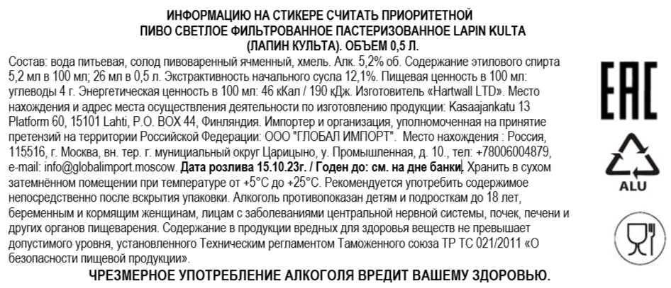 Lapin Kulta (в переводе с финского — Золото Лапландии) — импортное пиво из Финляндии, один из самых узнаваемых в мире брендов пива страны. Это светлое пиво создано по традиционной рецептуре из отборного ячменного солода и хмеля. В его вкусе соблюден великолепный баланс полноты и свежести, лёгкого хмелевого аромата и красивого янтарного цвета.