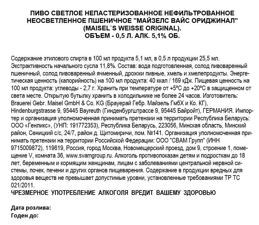 Пиво Maisels Weisse Original в стеклянной бутылке, 0,5 л обладает ярким насыщенным вкусом. Он понравится тем, кто ценит пикантную горчинку и насыщенность. В нем присутствует изящная солодовая сладость с цитрусовыми и фруктовыми мотивами, дополненная легкими нотками гвоздики, дрожжей, сладкого солода и приятной горчинкой. Дополняет вкусовые ощущения интересный аромат с композицией из хмеля, банана, цитруса с гвоздикой и легкими хлебными нюансами. Пенная шапка держится довольно долго, сразу не оседает. Цвет приятный, янтарно-оранжевый. Таким напитком можно моментально утолить жажду. Он самодостаточен и хорош соло. Идеально сочетается с копченой, соленой и вяленой рыбой, с острыми мясными закусками, пикантными сырами. Его можно подать с различными снеками. Отлично подходит для пикников: составит гармоничную пару с блюдами, приготовленными на открытом огне. Этот напиток варят по особой технологии. В процессе верхового брожения сусло превращается в высококачественный эль. У пенного отличные качественные характеристики и доступная цена. Чтобы в полной мере насладиться оригинальным вкусом и ароматом пенного напитка, наливать его стоит, придерживаясь следующих правил: стакан необходимо держать под углом 45 градусов; струю напитка направляйте на середину стакана; слишком медленно не стоит наливать пиво, иначе не будет крепкой пенной шапочки; как только бокал наполнится наполовину, поставьте его вертикально; если пены оказалось слишком много (более 2-4 см), значит, напиток наливали слишком быстро и был неправильно в��бран угол. Для напитка лучше всего использовать специальный пивной бокал или кружку – обычно объем такой посуды не меньше 0,3 л. Внутри сосуд должен иметь гладкие стенки, чтобы напиток мог стекать плавно.