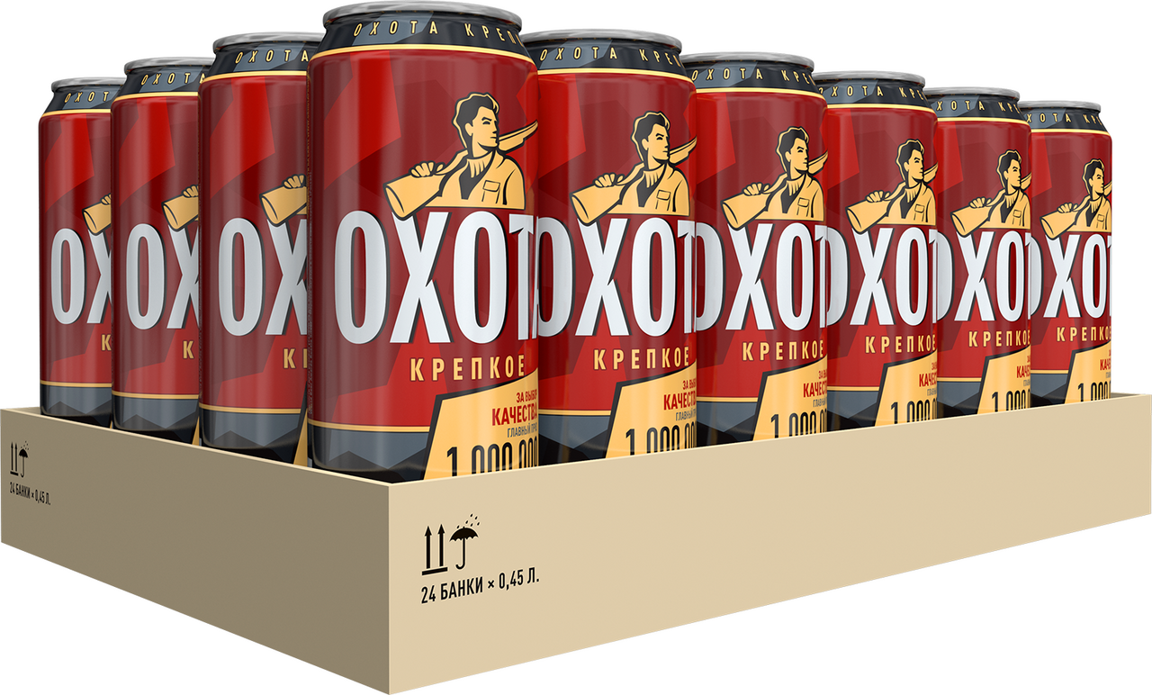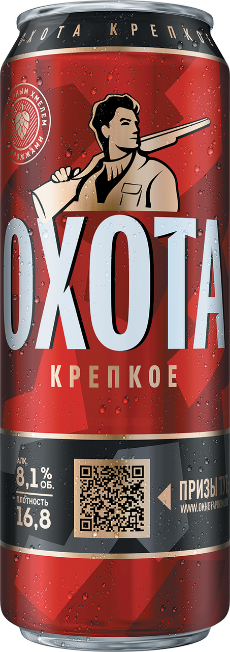 Охота крепкое — крепкое светлое пиво низового брожения янтарного цвета. Это насыщенное пиво с приятным послевкусием, несмотря на значительное содержание алкоголя 8,1%. Охота Крепкое варится по традиционному рецепту, и содержание алкоголя достигается дополнительной выдержкой и процессом брожения.