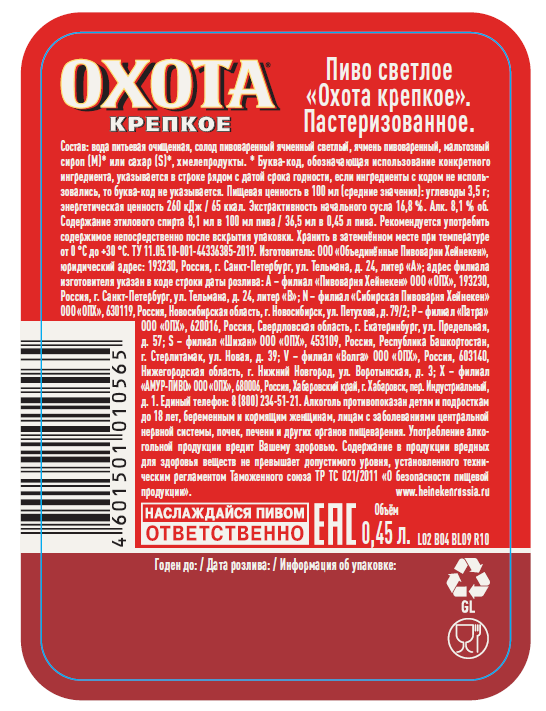 Пиво Охота крепкое, 0.45л