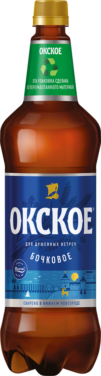 Сварено в Нижнем Новгороде. Для душевных встреч. Выпускается в новом современном дизайне. В основе цветовой палитры - выразительные оттенки синего. Каждый элемент дизайна несет особый смысл - гравюра Нижнего Новгорода и ладья отражают неизменную связь бренда с городом, а колос олицетворяет натуральность ингредиентов. Светлое фильтрованное пиво Окское Бочковое - это классический лагер с выраженным вкусом и яркой хмелевой горчинкой.