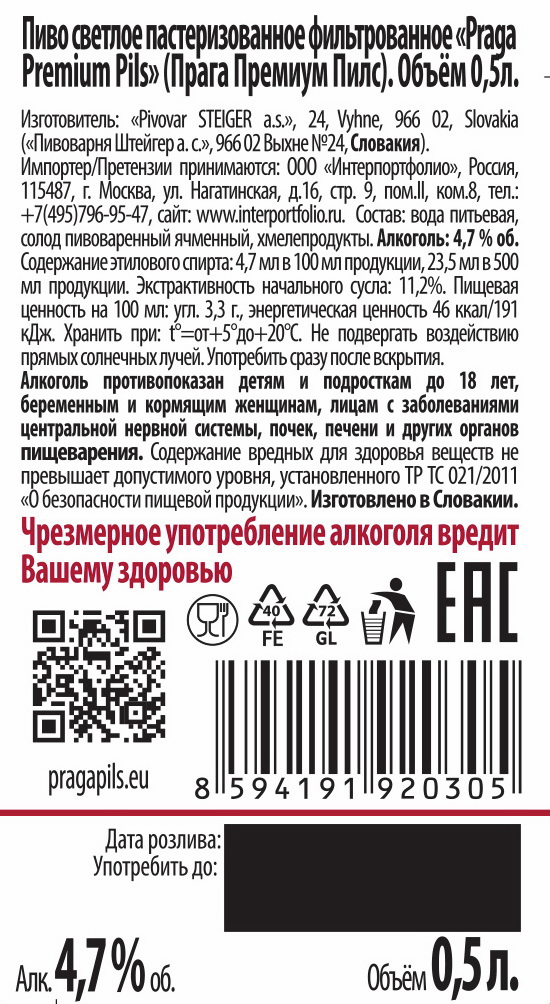 Пиво светлое пастеризованное фильтрованное Praga Premium Pils (Прага Премиум Пилс). Аутентичный чешский Пилснер, сваренный из хмеля, ячменя и воды. Его классический и сложный вкус демонстрирует приятную мягкость, легкую сухость и поразительную свежесть, а аромат наполнен необычными тонами бретцеля и инжирного джема.
