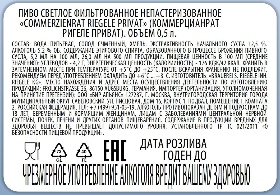 Riegele Commerzienrat Privat - классический экспортный лагер, который варится в баварском Аугсбурге. Пиво демонстрирует гармоничный, сбалансированный вкус и мягкий аромат с характерными солодово-хмелевыми оттенками, оно имеет крепость 5,2% и плотность начального сусла 12,8%. Пиво рекомендуется сочетать с мясными и рыбными блюдам, твердыми сырами и яблочным штруделем. Пиво завоевало 9 золотых медалей на DLG (German Agricultural Society), 6 золотых медалей на European Gold Star, а также звания “Лучшее пиво года и Лучшее пиво десятилетия.