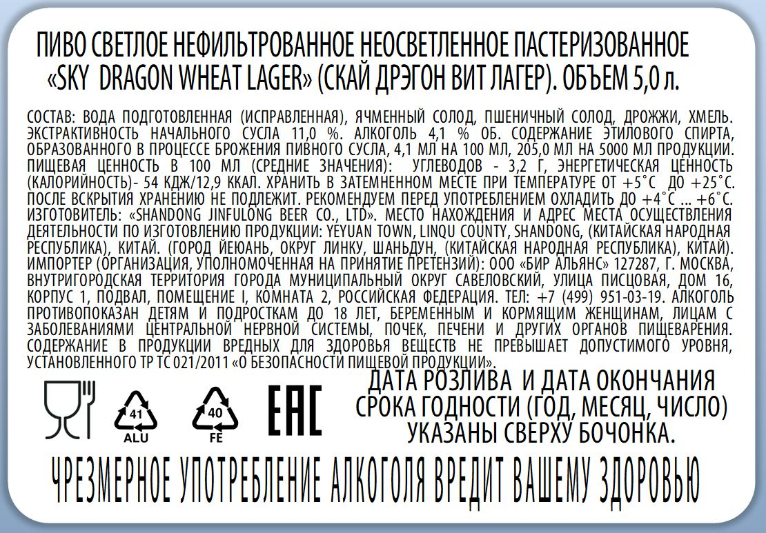 Пиво Sky Dragon Wheat lager светлое нефильтрованное, 5л