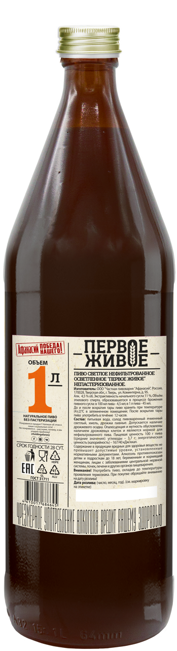 Пиво светлое Афанасий Первое живое нефильтрованное осветленное, 1л