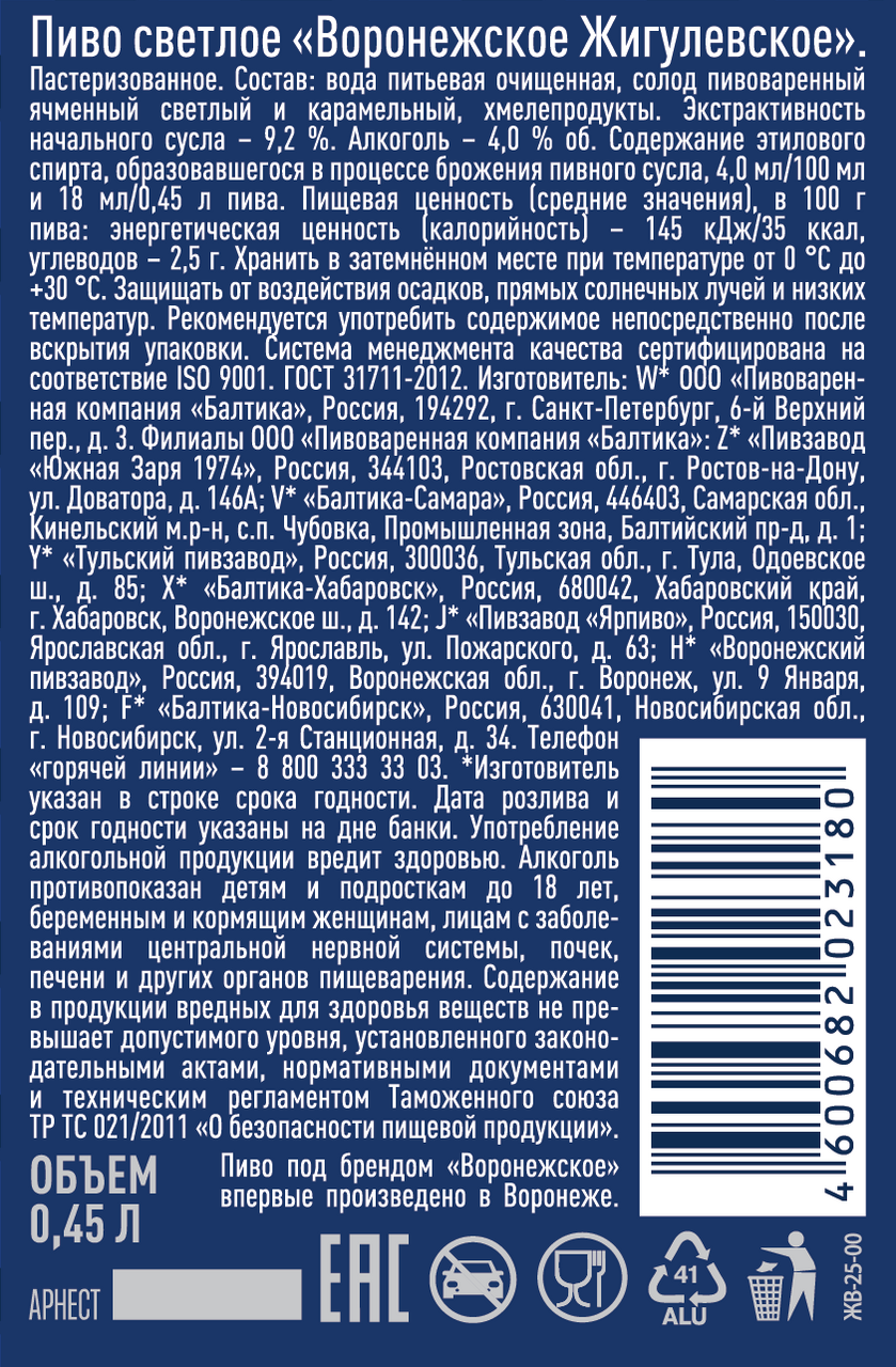 Светлый сорт пива c приятным солодовым ароматом и мягкой горчинкой, сваренный в советских традициях пивоварения. Жигулевское Воронежское сварено специально для жителей Воронежа с сохранением советских рецептов и по стандарту ГОСТ. Знаменитая марка пива, популярная и широко известная с советских времен. Жигулевское имеет небольшую плотность и приятную хмелевую горечь во вкусе. Пиво сварено по традиционной рецептуре исключительно из натуральных ингредиентов: светлого ячменного солода, хмеля и чистой воды. Пиво хорошо сочетается с закусками, орешками, гренками, зелеными салатами с добавлением рыбы или белого мяса, а также горячими блюдами из рыбы и белого мяса без добавления кислых или слишком жирных соусов.
