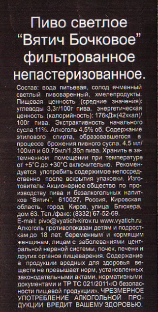 Пиво Вятич светлое бочковое, 1.35л - светлый непастеризованный лагер с освежающим вкусом и тонким цветочным ароматом. Его секрет кроется в использовании особенного сорта немецкого хмеля из Халлертау — Tettnanger, именуемого зеленым золотом Германии. По традиции, хмель при варке пива закладывается вручную главным пивоваром. Кроме хмеля используется чистая вода из источника Живой дар и светлый ячменный солод сорта Pilsener.