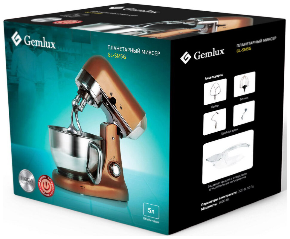 Планетарный миксер, настольный, 8 скоростей + пульс, откидная головка, съемная 4,5 л дежа из нержавеющей стали с защитной крышкой, 3 мешалки (двойной крюк, плоский битер, венчик), материал корпуса - алюминий, цвет золотой Настольный планетарный миксер Gemlux GL-SM5G предназначен для замеса дрожжевого и бездрожжевого теста различной вязкости, взбивания яиц, сливок, кремов и муссов, приготовления пюре, фарша и т.п. Оборудование имеет восемь скорос��ей вращения мешалки и режим пульс (кратковременное включение на максимальной мощности). В комплект поставки входят: – съемная дежа объемом 4,5 л из нержавеющей стали с ручкой для переноски, – защитная крышка дежи с широким желобом для добавления ингредиентов в процессе замеса. Крышка изготовлена из тритана - это легкий, небьющийся, высокоэкологичный пластик, не теряющий прозрачности с течением времени, – проволочный венчик, – цельнометаллический плоский битер (лопатка), – цельнометаллический двойной крюк запатентованной конструкции для быстрого и эффективного замеса дрожжевого теста. Корпус миксера изготовлен из окрашенного алюминия (цвет золотой). Рабочая головка откидывается для удобства снятия и установки дежи и мешалки и фиксируется сп��циальным рычагом.