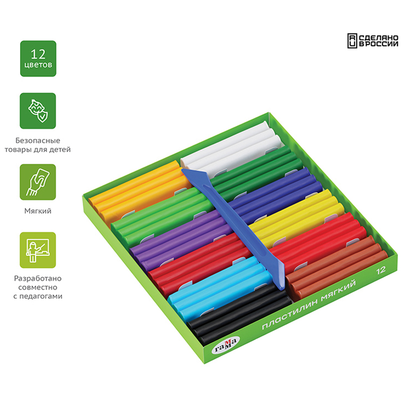 Предназначен для лепки и моделирования. Лепка из пластилина не только доставляет удовольствие, но и способствует снятию мышечного и психического напряжения, развитию мелкой моторики рук и пространственного мышления. Пластилин изготовлен из воскообразной массы с добавлением высококачественных пигментов и наполнителей, поэтому он не липнет к рукам, не оставляет жирных пятен, быстро согревается и становится пластичным. С помощью стека, вложенного в коробку, ребенок может наносить орнамент на свои изделия, что позитивно влияет на творческое мышление.