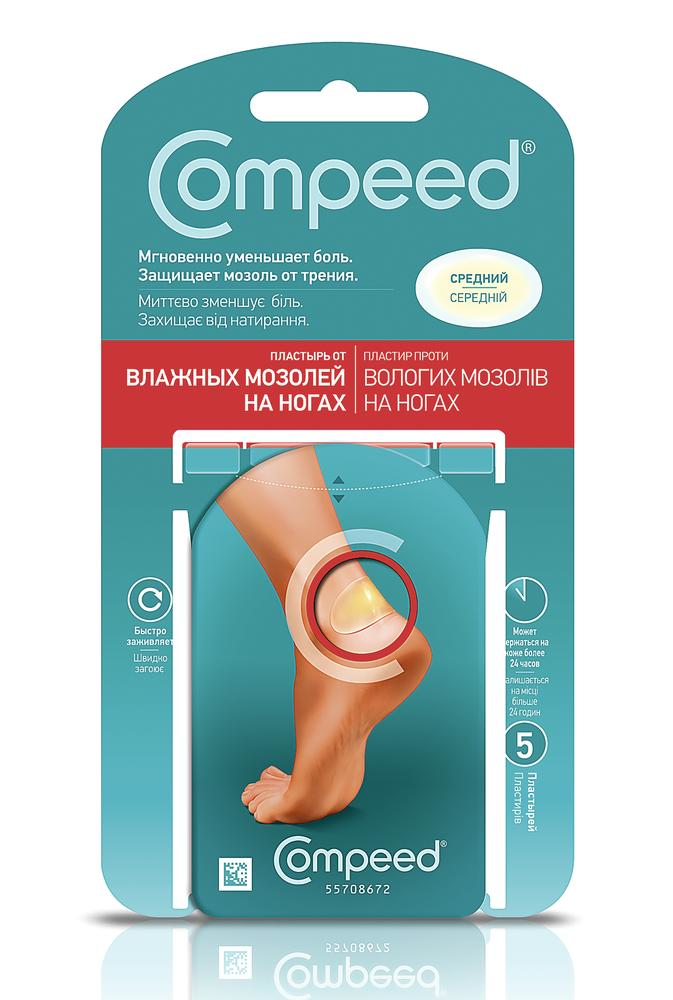 Пластырь от влажных мозолей на ногах, 76 х 45 мм. Мгновенно избавляет от боли. Пластырь действует как ''вторая кожа''. Он поглощает влагу и уменьшает давление на мозоль, быстро избавляя от боли и обеспечивая оптимальные условия для заживления. В пачке 5 штук.