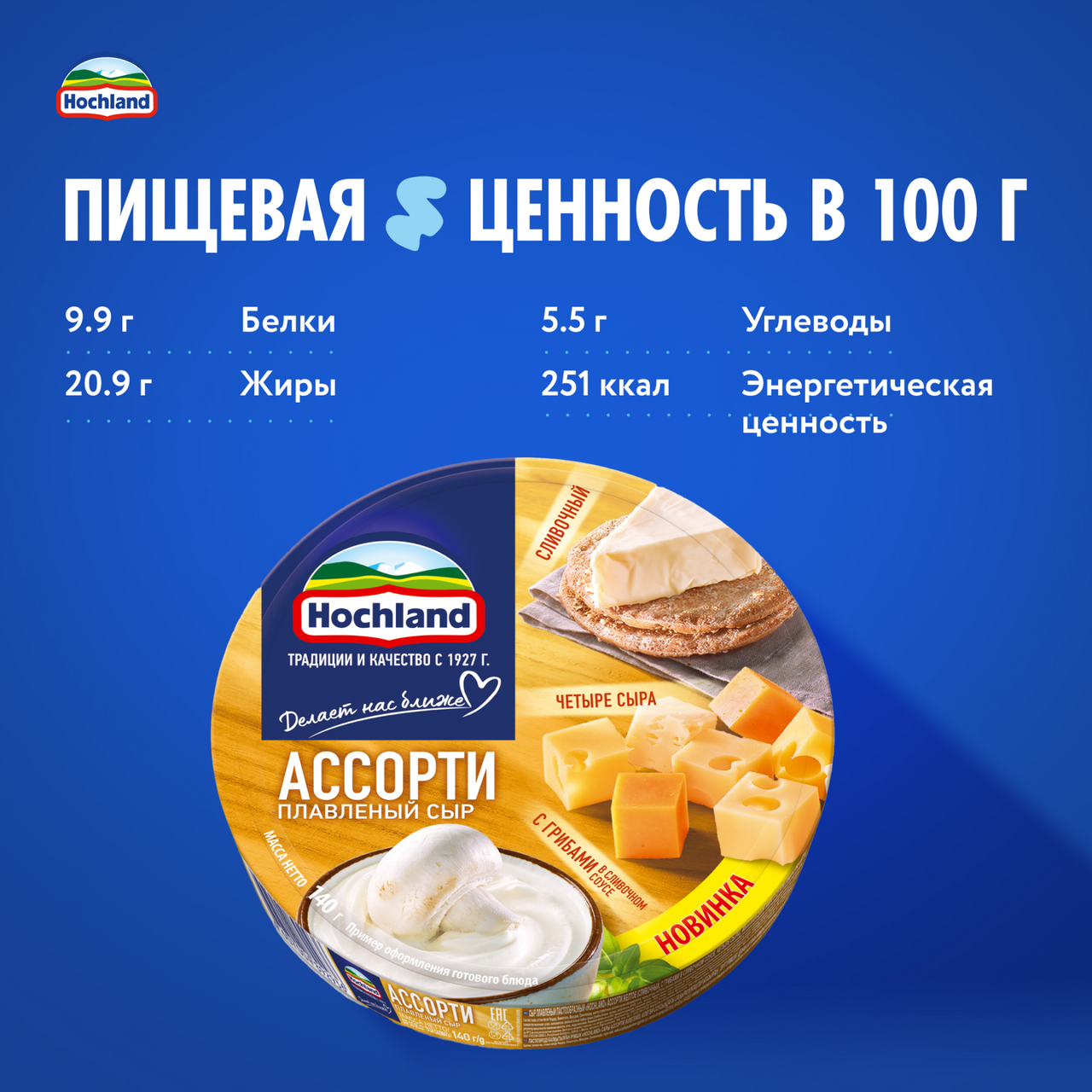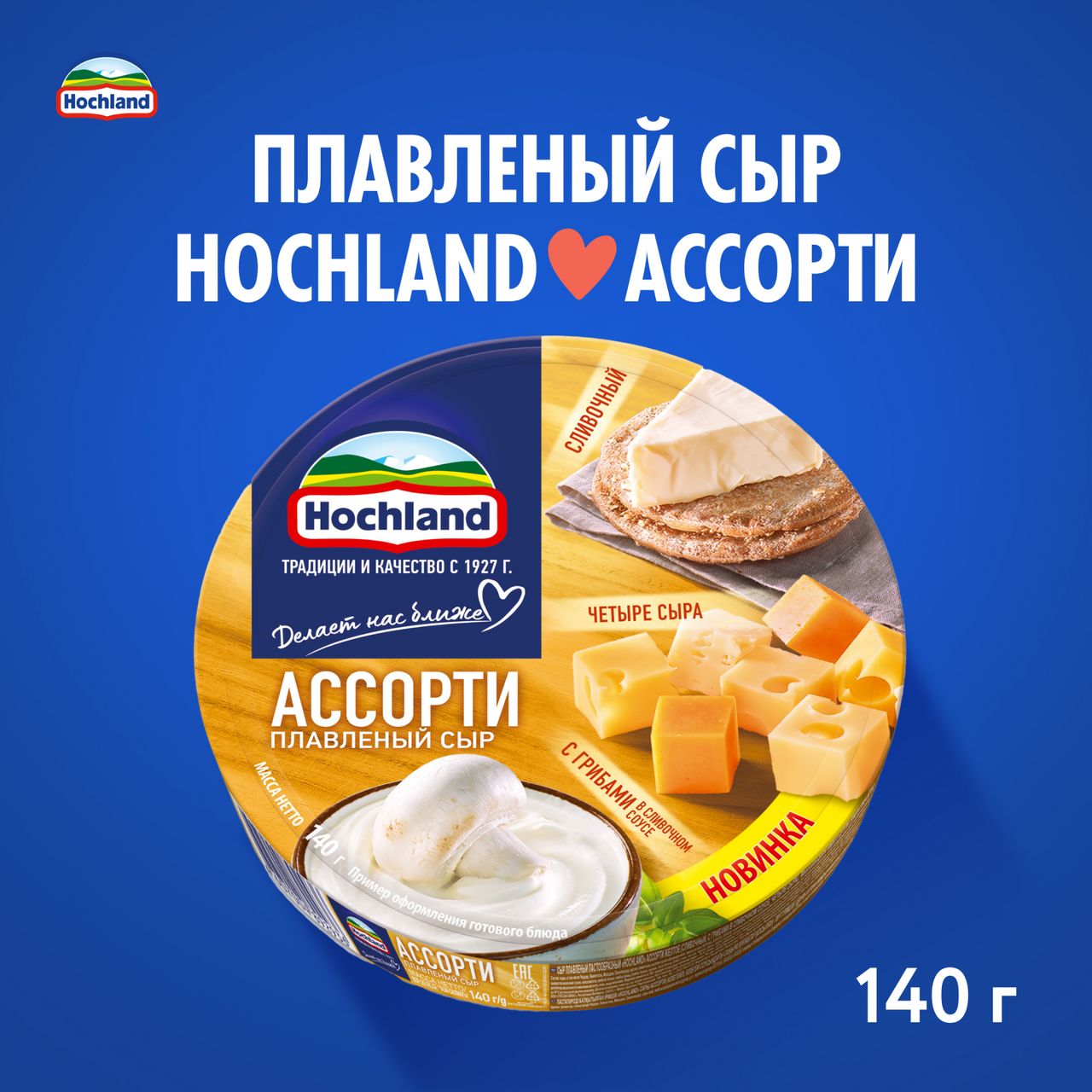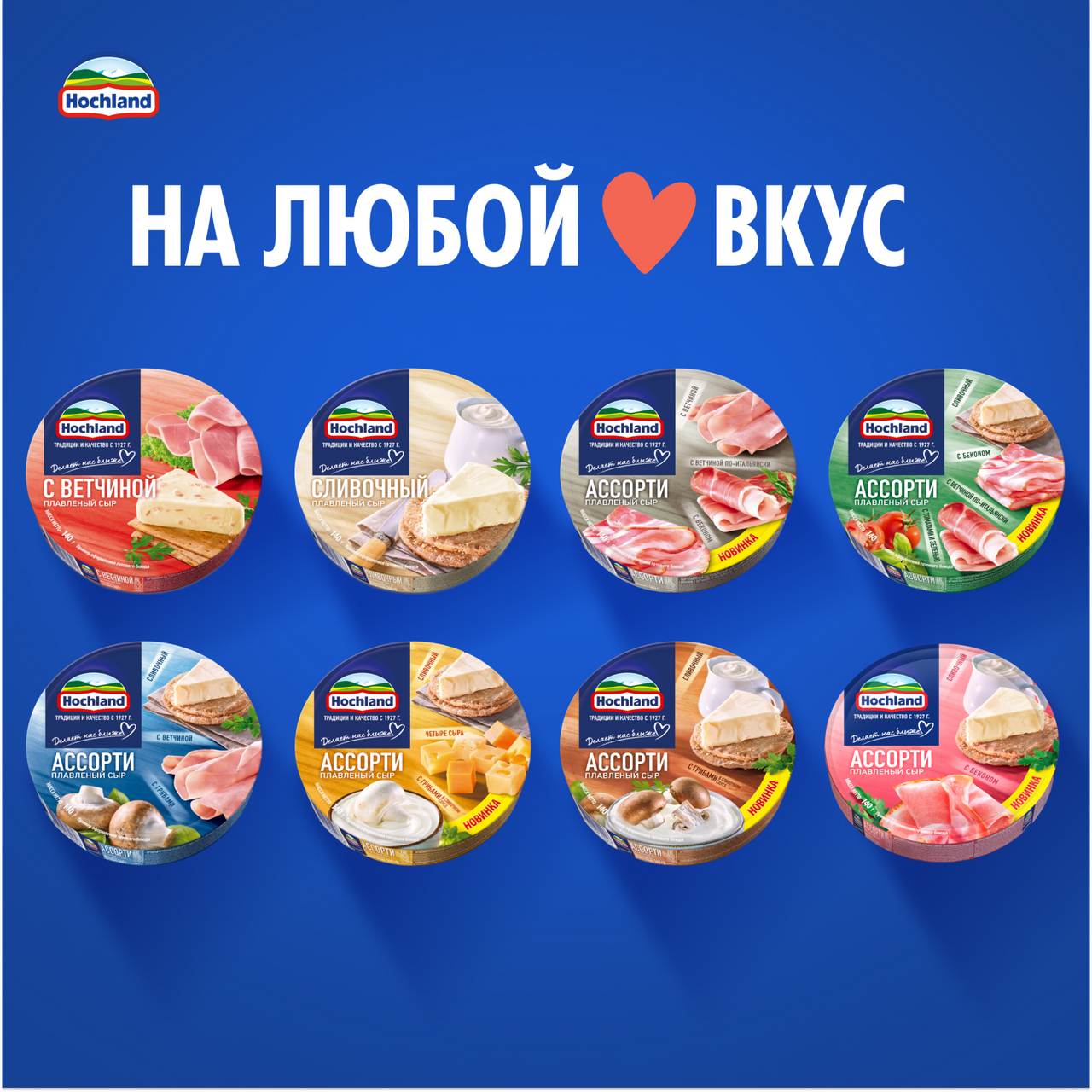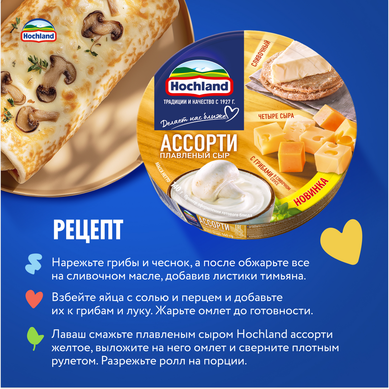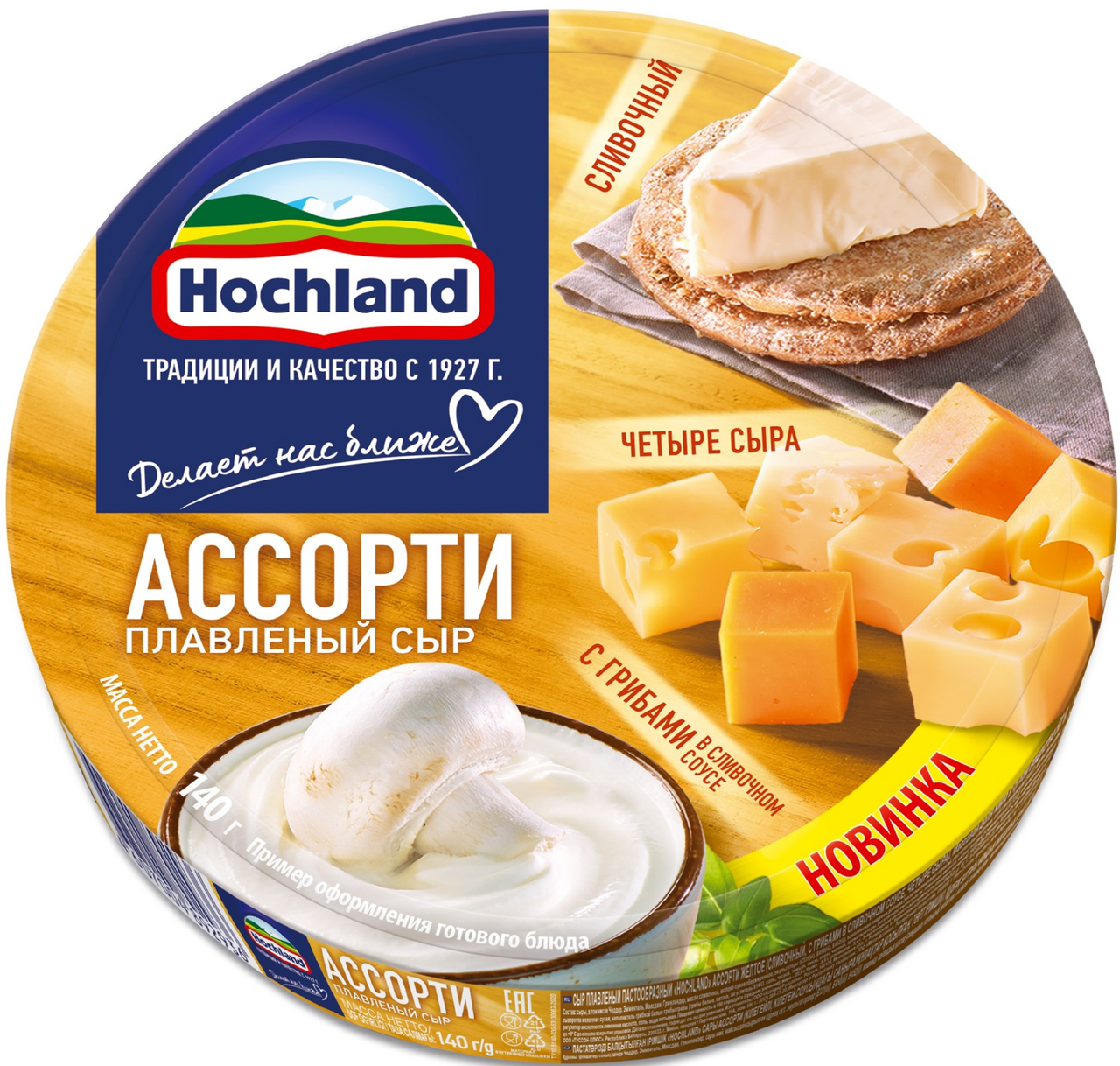 Новое желтое ассорти плавленого сыра Hochland сочетает в себе три ярких, но в то же время классических вкуса. В него входят: изысканный вкус четыре сыра из популярных видовых сыров, новый уникальный вкус с грибами в сливочном соусе и любимый всеми сливочный вкус. Все они сделаны из натурального сыра и объединены в ярком собрании вкусов в одной коробочке, которую так удобно взять с собой.