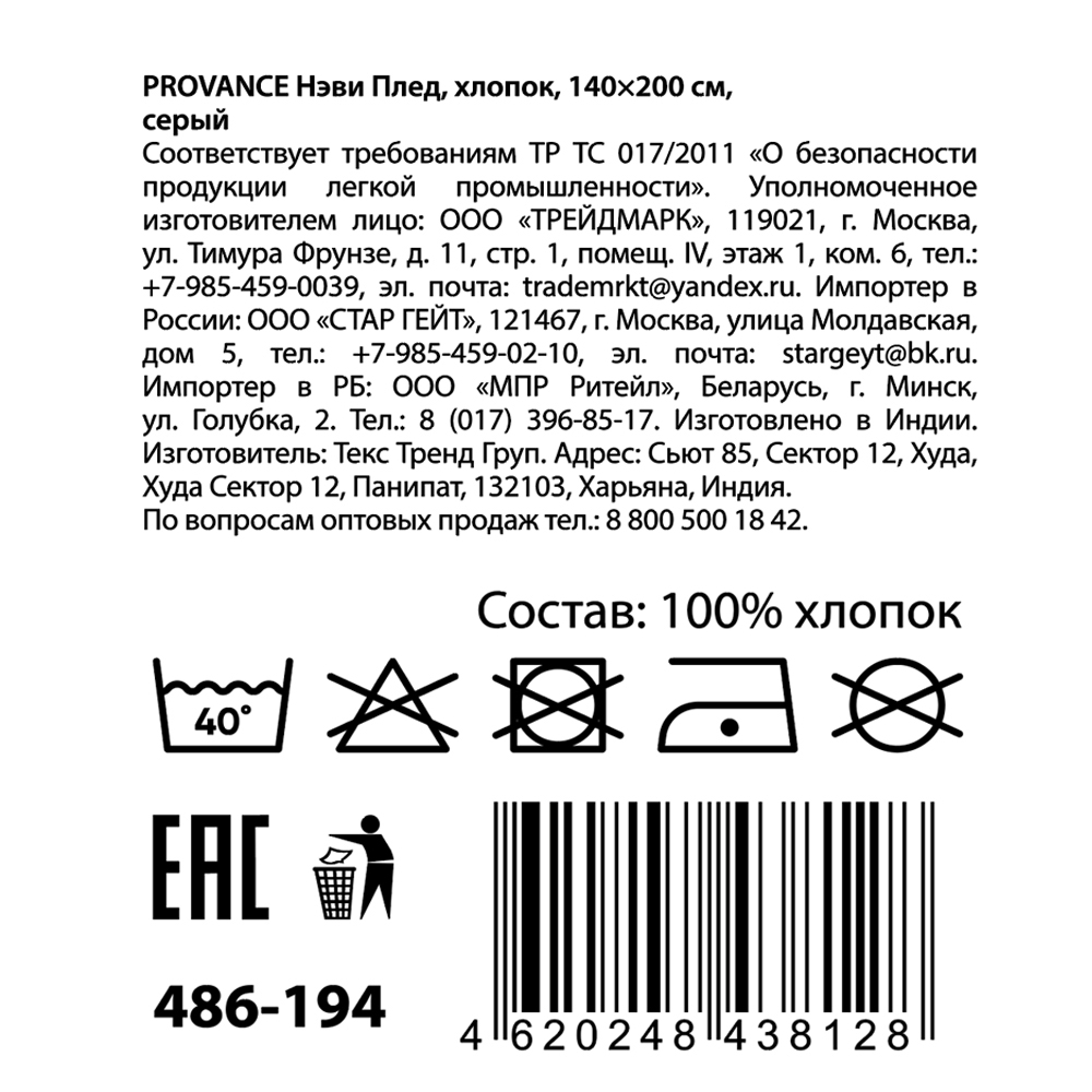 Плед Provance Нэви серый из хлопка, 140 x 200см