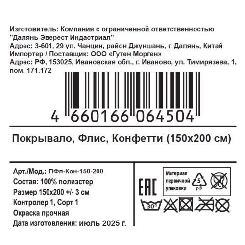 Плед Guten Morgen Конфетти флисовый, 150 x 200см - это идеальное сочетание тепла и легкости. Изготовленный из мягкого флиса, он быстро согреет вас в прохладные вечера и подарит приятное ощущение уюта. Легкий, но при этом отлично сохраняющий тепло, этот плед станет вашим незаменимым спутником дома, на даче и в поездках. Его гладкая, бархатистая поверхность не вызывает раздражения, легко стирается и долго сохраняет яркость цвета.