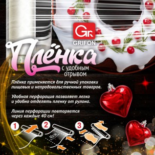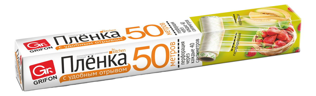 Пленка пищевая Grifon с перфорацией, 290см х 50м удобно использовать для упаковки мяса, сыра, фруктов или любых других продуктов. К её очевидным преимуществам можно отнести прочность, хорошую растяжимость и газопроницаемость. Пленка позволяет пропускать кислород, а наружу выпускать углекислый газ, именно поэтому внутри не накапливается конденсат. Благодаря барьерным свойствам пищевая пленка Grifon продлевает срок хранения продуктов и они дольше остаются свежими. Пленку можно использовать для герметизации и для запечатывания готовых блюд в пищевых контейнерах. Идеальная клейкость поверхности и высокий уровень прочности и растяжимости пленки Grifon позволяют сохранить свежесть приготовленных блюд в течение продолжительного времени.