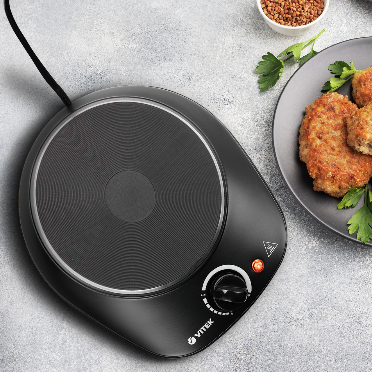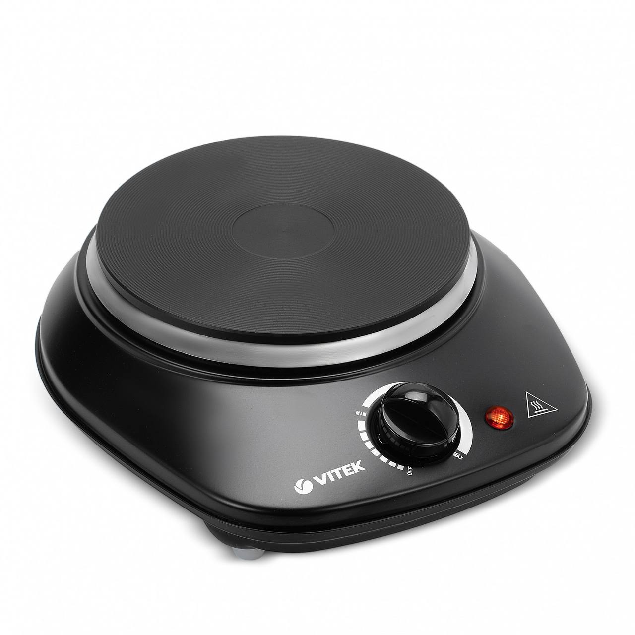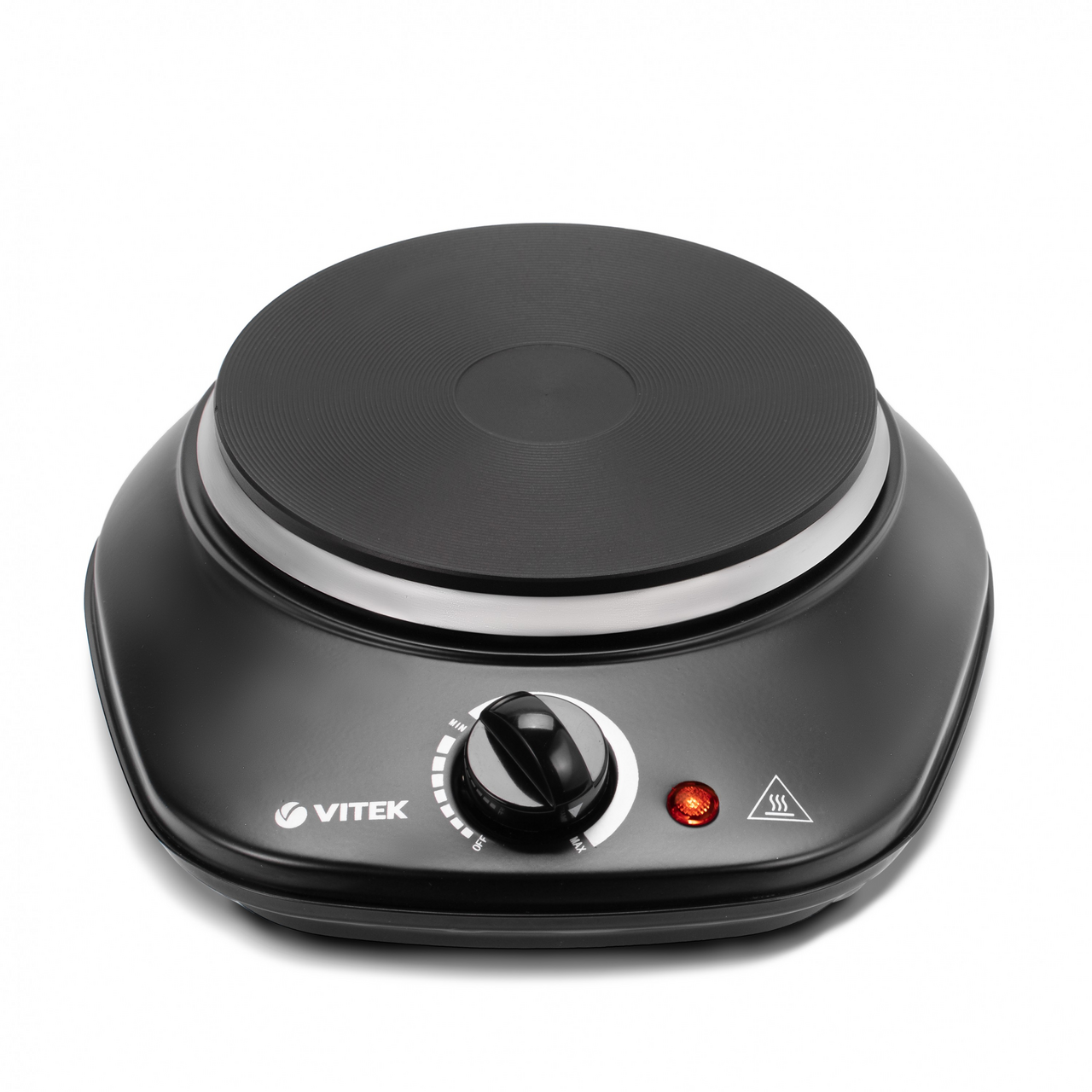 Плитка электрическая Vitek 3701 компактная и удобная. На ней можно готовить разнообразные блюда или разогревать их. Она безопасна в использовании. Портативную одноконфорочную плитку удобно взять с собой на дачу. Ее можно использовать в качестве дополнительной варочной поверхности дома или в небольших заведениях общественного питания. Такой прибор устанавливают в местах, где нет возможности использовать габаритную технику (например, на офисных кухнях). Электроплитка довольно мощная и быстро нагревается до заданной температуры. Открытый огонь отсутствует, нагреватель скрыт под чугунной конфоркой. Этот материал совместим с любой посудой. В качестве дополнительных мер безопасности имеется опция автоматического отключения. Ухаживать за плитой легко. Достаточно соблюдать рекомендации производителя, и она прослужит много лет. Размеры электроплитки позволяют поставить на варочную поверхность небольшую кастрюлю, чайник или сковороду. Диаметр конфорки – 15,5 см. Готовить на ней максимально комфортно. Управление происходит путем поворота ручки, расположенной на передней панели. С ее помощью выбирается оптимальный температурный режим для разогрева блюд или их приготовления.
