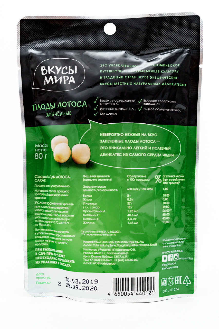 ПЛОДЫ ЛОТОСА запеченные, 80 г – натуральный и невероятно полезный продукт. С его помощью вы сможете узнать об особенностях гастрономии Индии. Плоды лотоса в готовом виде внешне похожи на лесные орехи. Их запекают в легком сиропе из сахара. По традиции их употребляют в качестве десерта или перекуса. Плоды лотоса богаты витаминами А, Е и С, необходимыми для крепкого иммунитета, здоровья и красоты кожи. В этих экзотических снеках нет масла, консервантов и другой химии. Продукт подойдет ветерианцам, приверженцам диетического питания и постящимся людям. Для дополнительного раскрытия вкуса и аромата этой экзотики плоды лотоса можно разогреть в мироковолновке. Приобрести ПЛОДЫ ЛОТОСА запеченные, 80 г можно можно в в торговом центре METRO.Состав: плоды лотоса, сахар.Пищевая ценность: белки – 8 г, жиры – 0,5 г, углеводы – 37 г.Энергетическая ценность: 150 ккал/100 г.Условия хранения: при температуре от 2?С до 8?С в течение 540 дней.