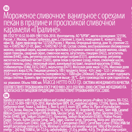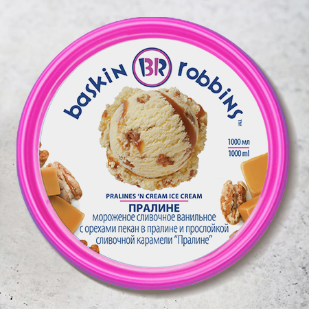 Мороженое BASKIN ROBBINS Пралине, 600г – это один из классических сортов мороженого от известного российского производителя, неизменно радующего отечественных потребителей отличным качеством продукции на протяжении многих лет. Освежающее лакомство изготовлено на основе натуральных сливок и обладает нежным вкусом и легкой консистенцией. В состав входят орехи пекан в пралине и карамельная прослойка, добавляющие вкусовой композиции свои нотки.Мороженое можно есть в качестве самостоятельного десерта, а также изготавливать на его основе другие интересные лакомства, добавляя фрукты, шоколадную крошку или различные сиропы. Вы можете купить мороженое BASKIN ROBBINS Пралине, 1л в торговом центре METRO.Производитель: ЗАО БРПИ, Россия.Объем: 1л.Без ГМО.Состав: сливки, восстановленное обезжиренное молоко, сахарный сироп,глюкозный сироп, карамельная прослойка, орехи пекан в пралине,ароматизатор натуральный ванилла – ванилин, пищевой краситель (Е-160a),стабилизаторы и эмульгаторы (Е-471, Е-412, Е-407, Е-466).Массовая доля молочного жира 8,5%.Пищевая ценность на 100г: белки 4г; жиры 12г; углеводы 31г.Энергетическая ценность: 250 ккал.Повторно не замораживать.Хранить при t -18C.Срок годности: 365 дней.ТУ 9228-016-00419762-09