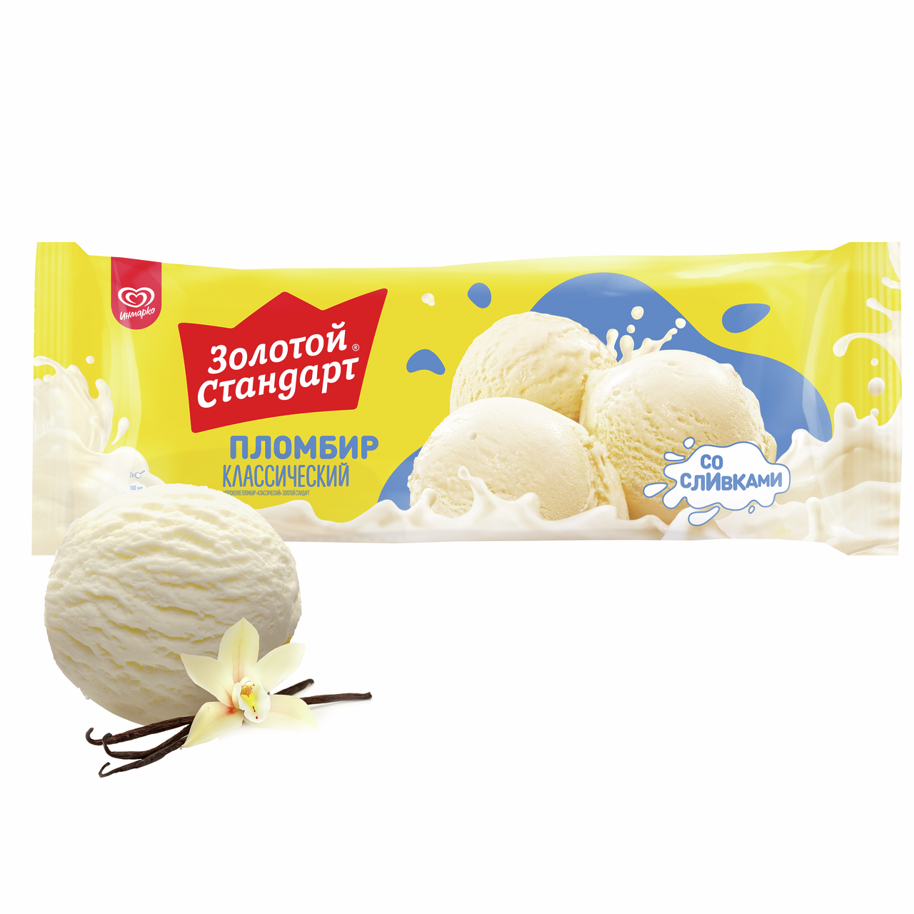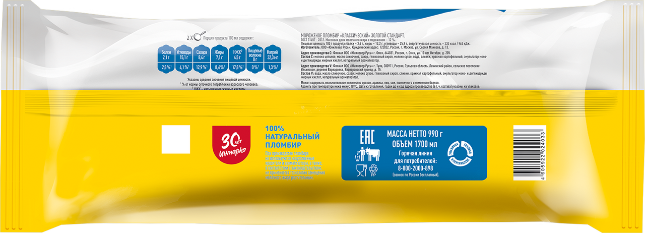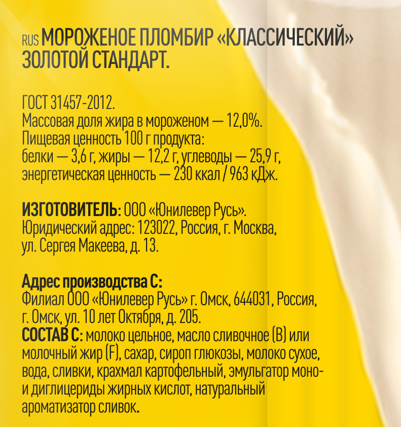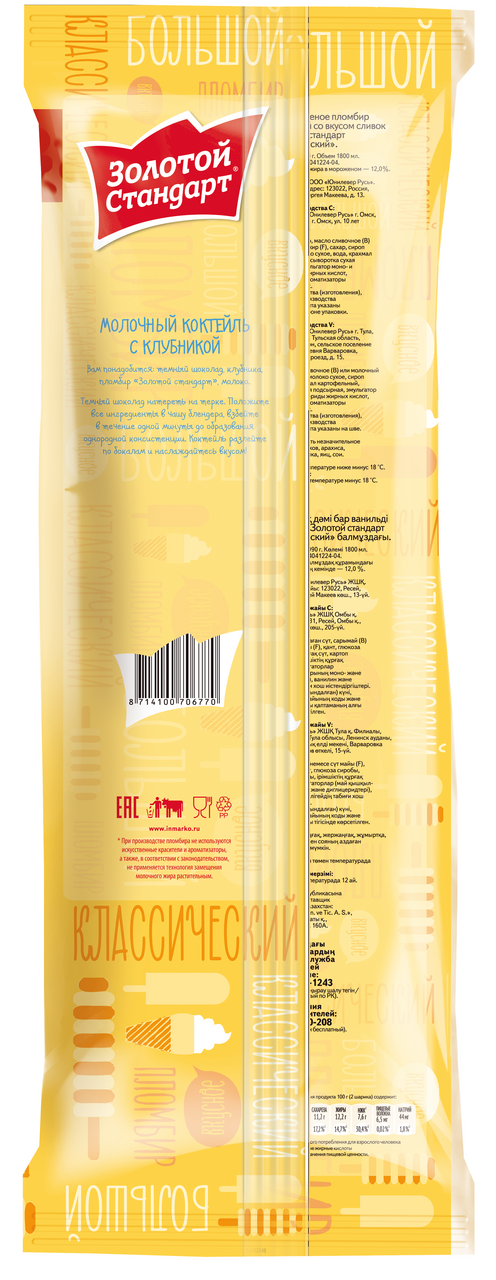 Золотой Стандарт мороженое пломбир весовое Классический со вкусом сливок 990 гр — это 100% натуральный пломбир со вкусом сливок для всей семьи или большой компании. Классический пломбир Золотой Стандарт в весовом формате — мороженое для тех, кто любит насыщенный сливочный вкус, а также предпочитает традиционный пломбир другим видам мороженого. Густая кремовая консистенция пломбира способствует тому, что мороженое медленно тает во рту, приятно освежает и оставляет приятное послевкусие сливок. Классический пломбир Золотой Стандарт в весовом формате – мороженое для тех, кто предъявляет высокие требования к натуральности состава и качеству продуктов. Мы никогда не добавляли и никогда не будем добавлять в наш пломбир искусственные красители, ароматизаторы и консерванты, а также, в соответствии с законодательством, при производстве пломбира не применяется технология замещения молочного жира растительным. Классический пломбир Золотой Стандарт в весовом формате содержит исключительно натуральные ингредиенты высшего качества. Основные ингредиенты классического пломбира Золотой Стандарт в весовом формате: молоко, сливочное масло, и сахар. Классический пломбир Золотой Стандарт в весовом формате - вкуснейший десерт в удобном формате, который станет отличным дополнением для праздничных семейных застолий или просто порадует ваших близких в любой другой день. Миссия пломбира Золотой стандарт — объединять семьи, делая отдых в кругу семьи особенно душевным. Мы хотим, чтобы моменты семейной близости стали вкуснее, ярче и остались в памяти на года!
