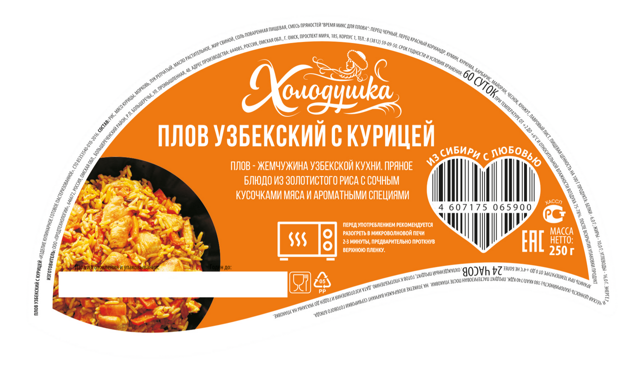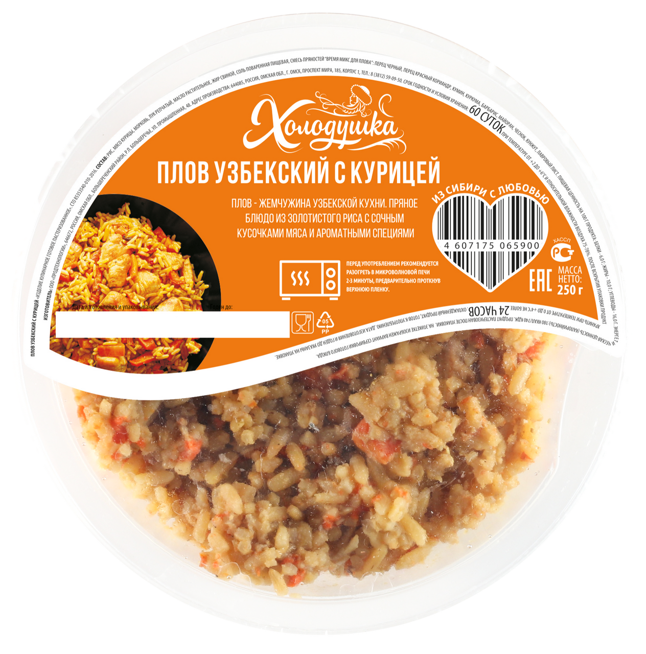 Рис, мясо курицы, морковь, лук репчатый, масло растительное, соль поваренная пищевая, смесь специй зира, куркума, барбарис, перец чёрный, перец красный, масло растительное.