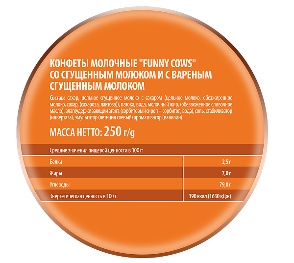 Конфеты Победа вкуса Funny Cows, 250 г – нежное лакомство с ярким, насыщенным вкусом, приготовленное на основе цельного сгущенного молока с сахаром. Они идеально подходят в качестве быстрого перекуса или дополнения к семейному или праздничному столу. Угощение хорошо сочетается с горячим чаем или кофе. Оно помогает утолить чувство голода, наполнить организм энергией и поднять настроение в хмурые ненастные дни. Кроме того, этот нежный десерт оказывает положительное влияние на умственную деятельность и повышает способность к обучению. Это полностью натуральный продукт, который был приготовлен в соответствии с традиционной и проверенной временем рецептуре. ГМО в составе отсутствует. Каждая конфета аккуратно завернута в плотный фантик. Продукция упакована в пластиковый пакет типа флоу-пак, обеспечивающий удобную транспортировку и хранение. Конфеты – неотъемлемая часть подарка на Новый год. Им обрадуются взрослые и маленькие сладкоежки. К тому же конфеты – отличная альтернатива калорийным пирожным и тортам и хорошая идея для похода в гости.