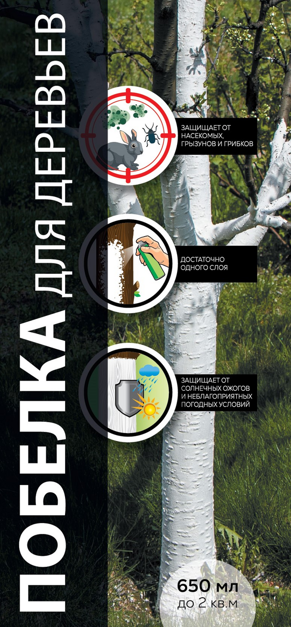 Средство разработано специально для профилактической обработки деревьев и кустарников. Покрытие защищает кору дерева от перепадов температур, вредителей, ожогов солнечными лучами, а также от проникновения инфекций. Сохраняет естественный воздухообмен коры.Высокая укрывистость обеспечивает экономичный расход средства. Для эффективной защиты достаточно нанести один слой побелки. Состав не стекает и не образует потеков. Позволяет легко и быстро, без лишних подготовительных этапов и дополнительных приспособлений произвести обработку. Расход: 1 баллон на 1,5-2 квадратных метров, в зависимости от количества слоев.