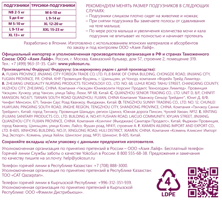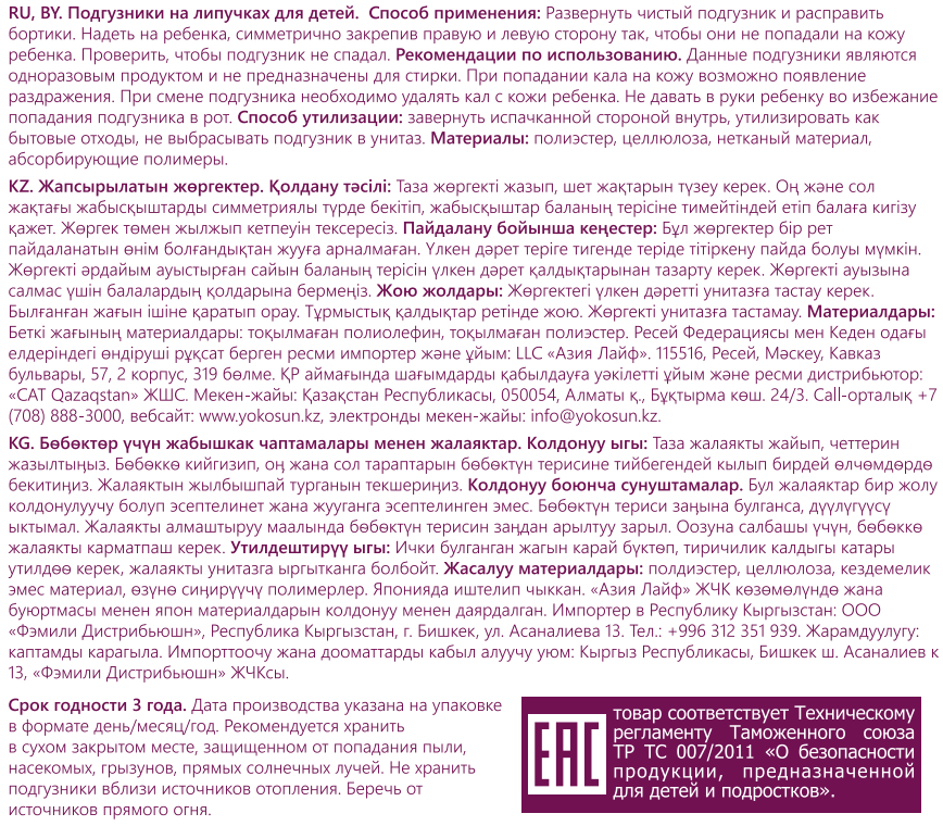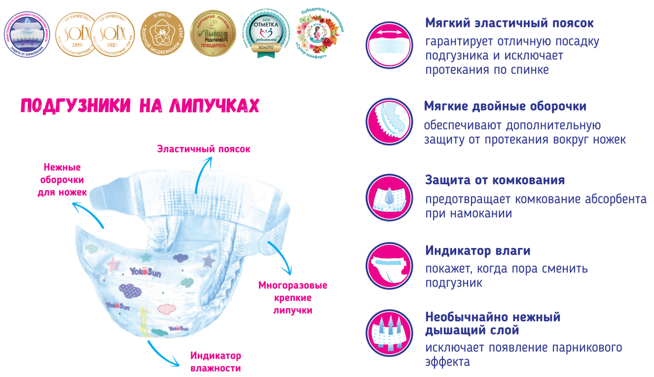 Подгузники YokoSun - это новые подгузники, отвечающие всем требованиям современных мам. В изготовлении подгузников используется японский абсорбент, который быстро впитывает и удерживает влагу, поддерживая сухость в течение длительного времени. Прилегающий к телу поясок. Эластичный поясок мягко и плотно облегает талию малыша, препятствует подтеканию жидкости вдоль спины. Новый дышащий нижний слой. Моментально распределяет влагу внутри и не дает ей слеживаться, защищает нежную кожу малыша от сыпи, оставляя ее сухой и чистой. Невидимый абсорбирующий слой. Уникальный состав среднего впитывающего слоя обеспечивает быстрое впитывание жидкости и сухую поверхность подгузника, защищая кожу малыша от покраснений. Продукт сертифицирован по ISO9001.